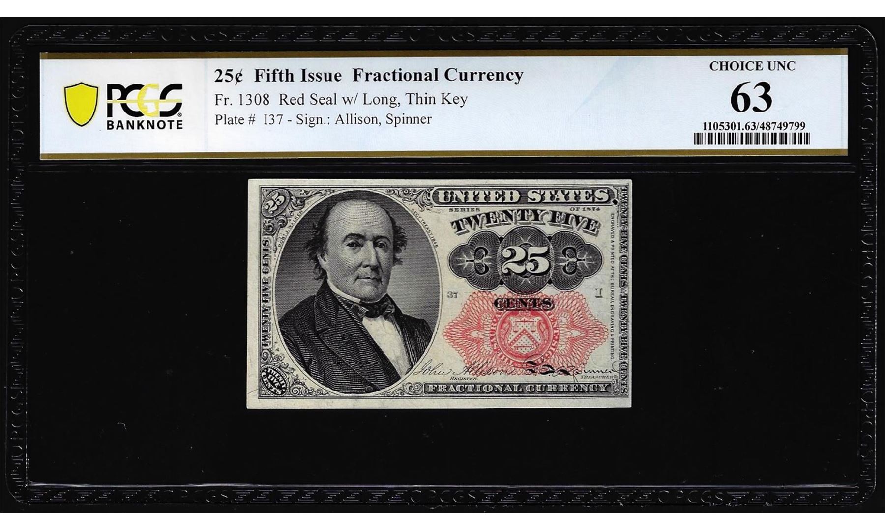 One 1874 Fifth Issue Twenty-Five Cents Fractional Currency Note Fr.1308 PCGS Choice Unc 63. PCGS Graded.
