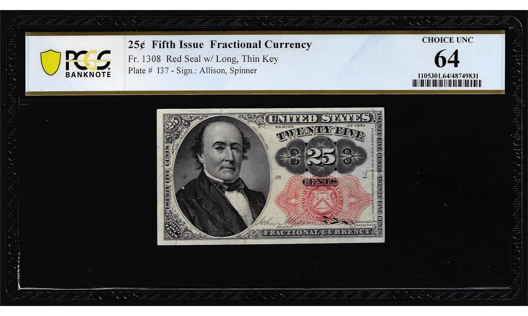 One 1874 Fifth Issue Twenty-Five Cents Fractional Currency Note Fr.1308 PCGS Choice Unc 64. PCGS Graded.