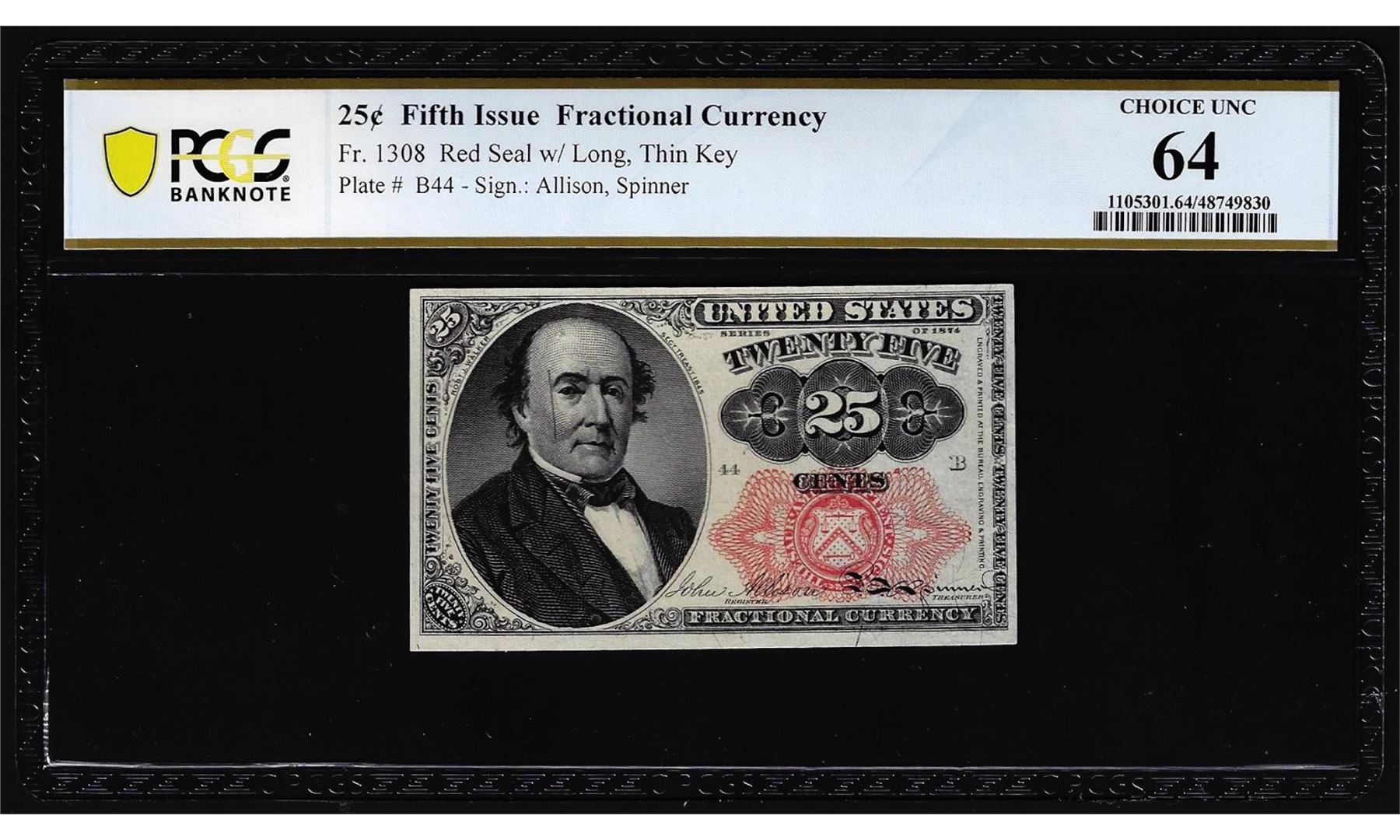 One 1874 Fifth Issue Twenty-Five Cents Fractional Currency Note Fr.1308 PCGS Choice Unc 64. PCGS Graded.