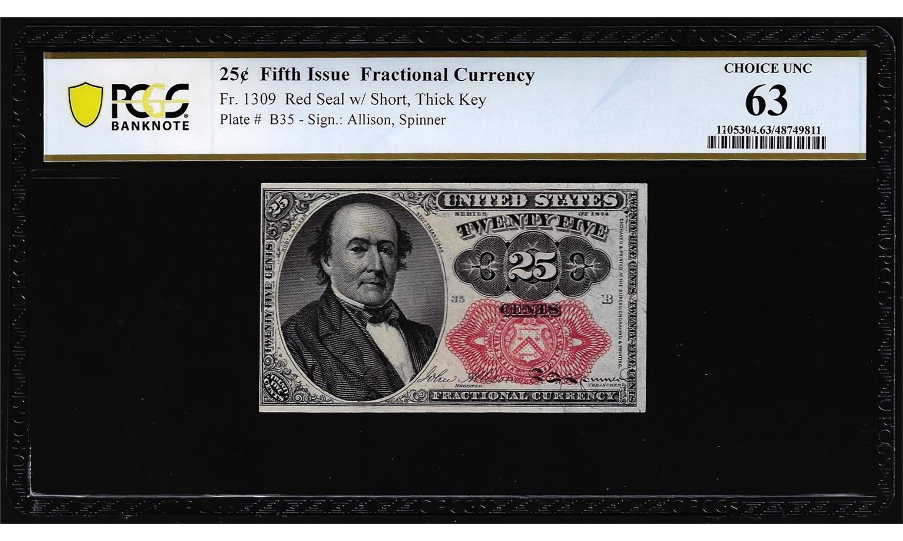 One 1874 Fifth Issue Twenty-Five Cents Fractional Currency Note Fr.1309 PCGS Choice Unc 63. PCGS Graded.