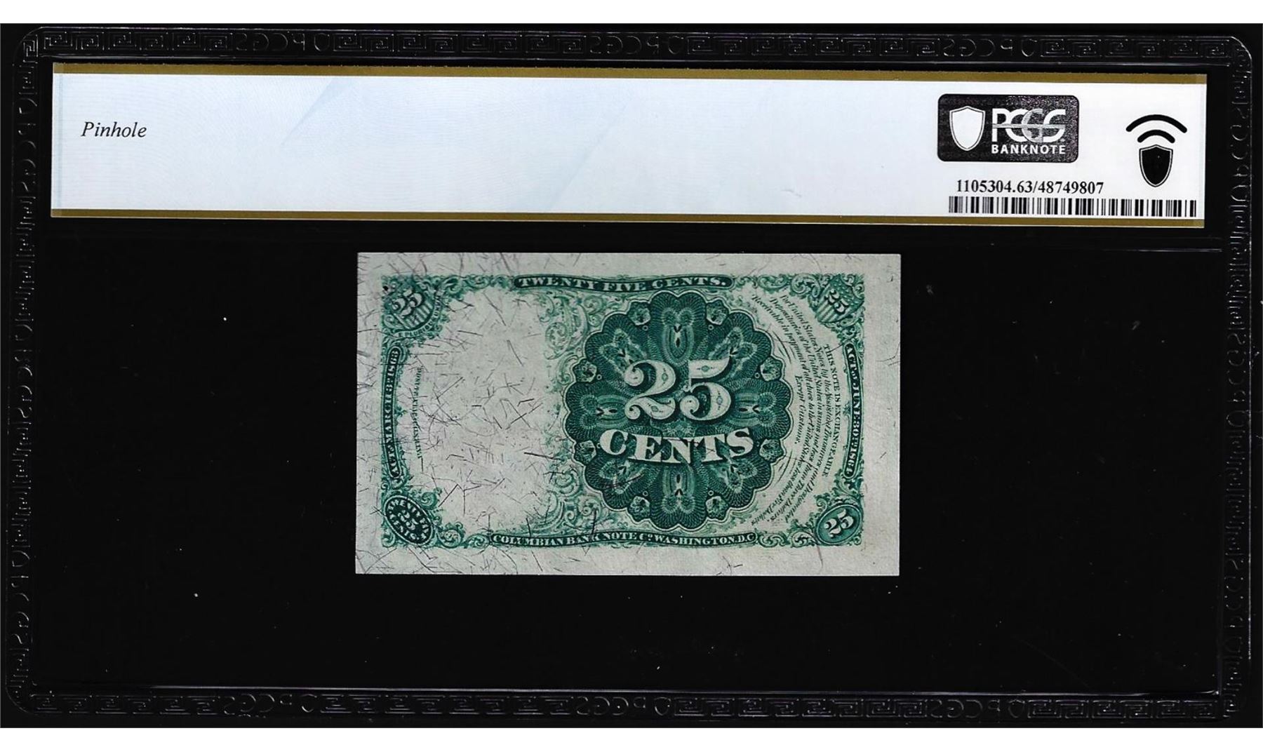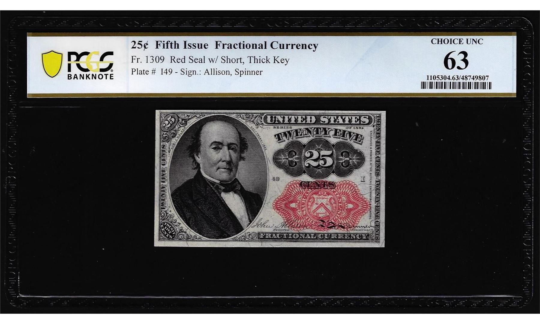 One 1874 Fifth Issue Twenty-Five Cents Fractional Currency Note Fr.1309 PCGS Choice Unc 63. PCGS Graded.
