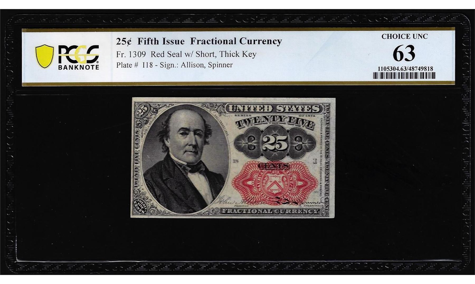 One 1874 Fifth Issue Twenty-Five Cents Fractional Currency Note Fr.1309 PCGS Choice Unc 63. PCGS Graded.