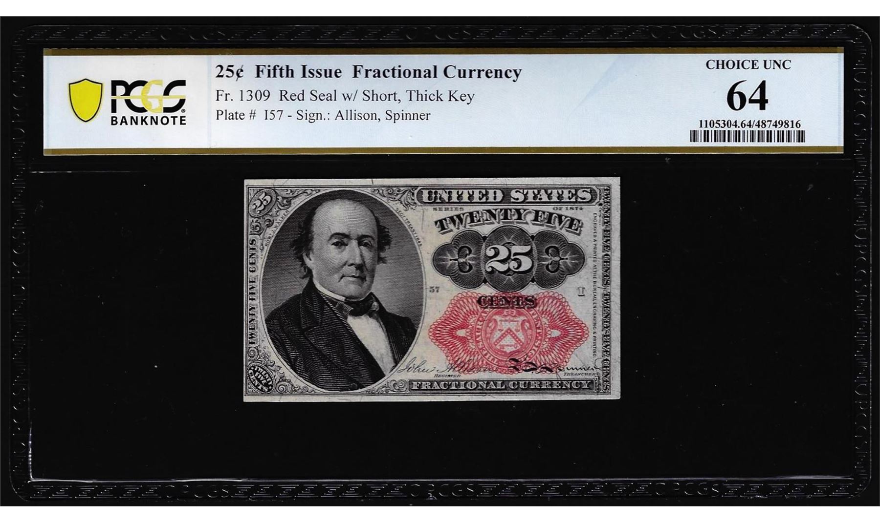 One 1874 Fifth Issue Twenty-Five Cents Fractional Currency Note Fr.1309 PCGS Choice Unc 64. PCGS Graded.