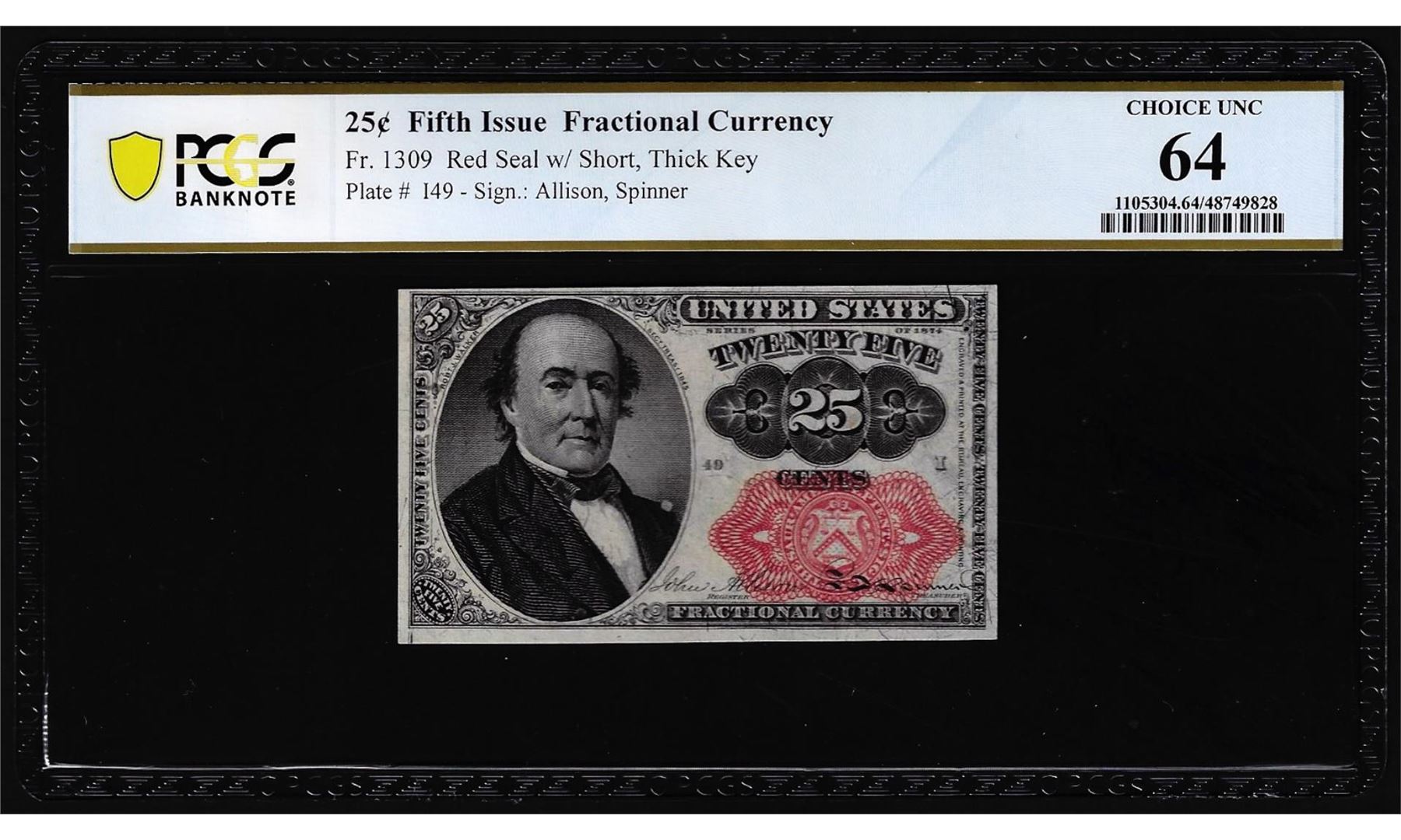 One 1874 Fifth Issue Twenty-Five Cents Fractional Currency Note Fr.1309 PCGS Choice Unc 64. PCGS Graded.