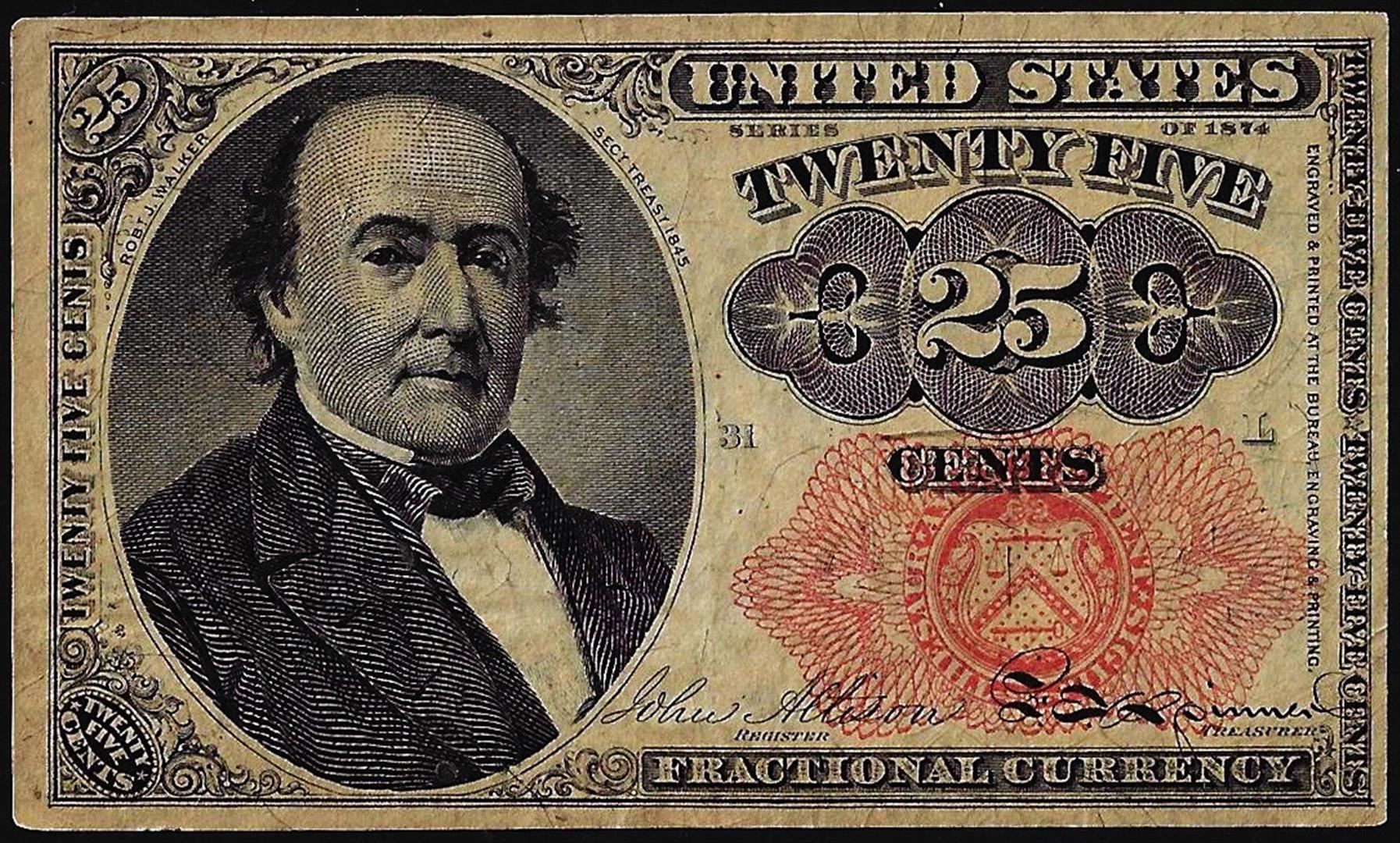 One 1874 Fifth Issue Twenty-Five Cents Fractional Currency Note.
