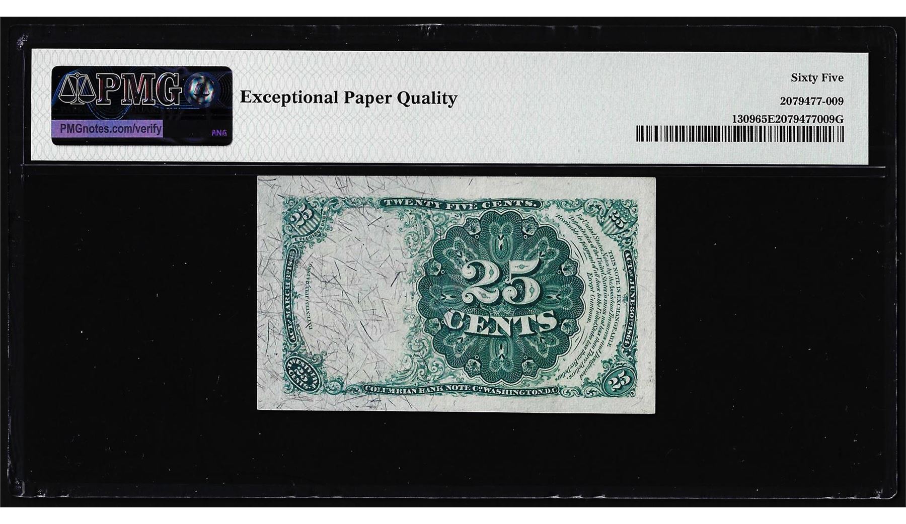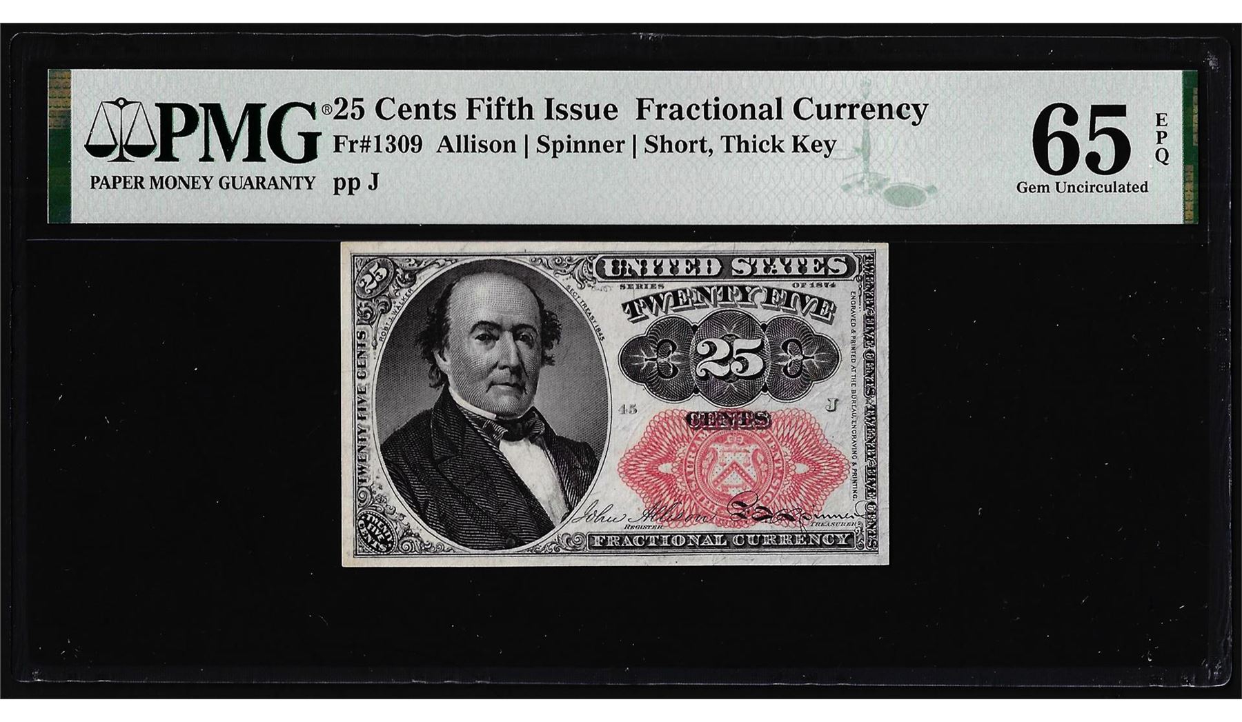 One 1874 Fifth Issue Twenty-Five Cents Fractional Note Fr.1309 PMG Gem Uncirculated 65EPQ. PMG Certified.