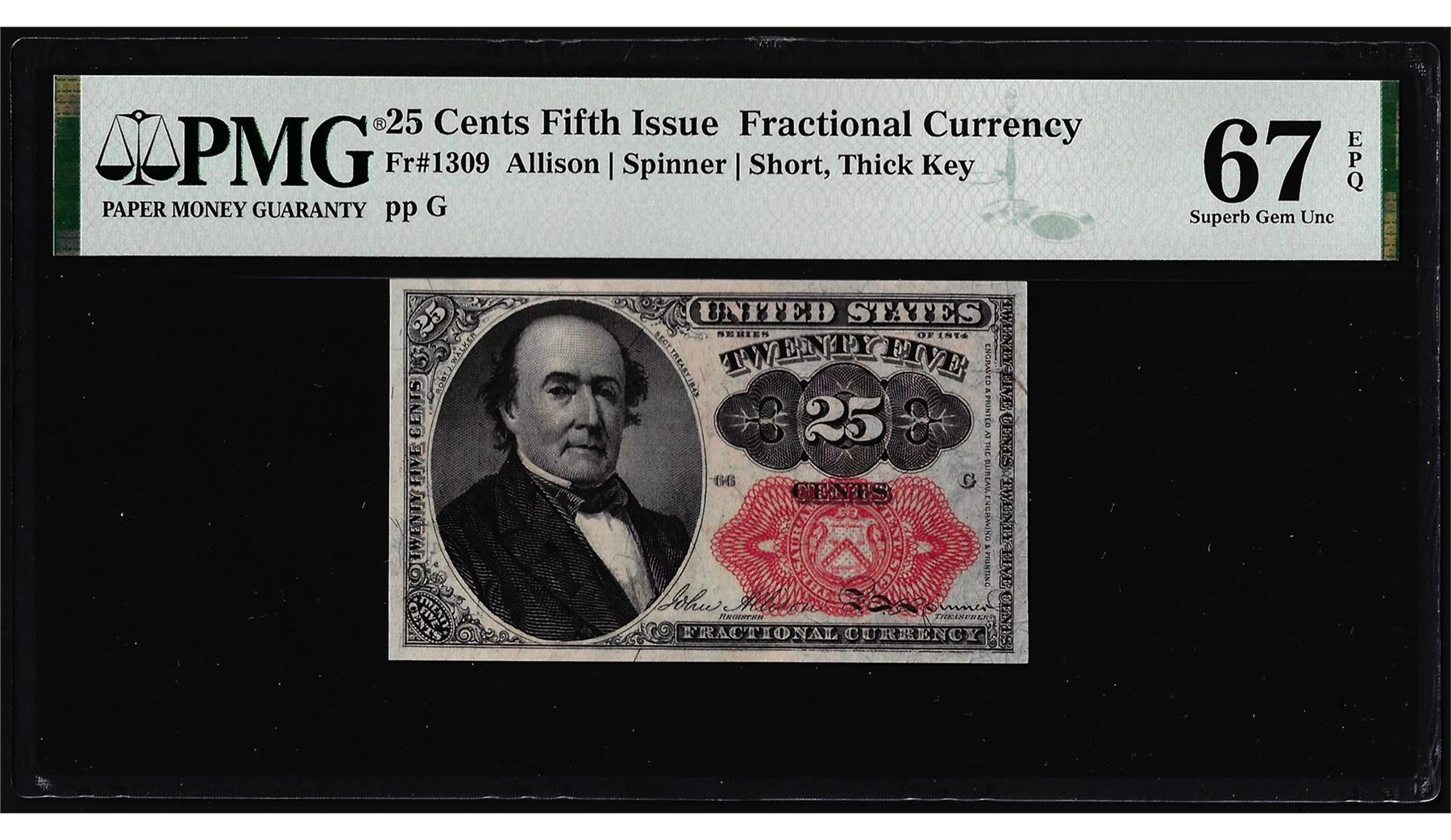 One 1874 Fifth Issue Twenty-Five Cents Fractional Note Fr.1309 PMG Superb Gem Uncirculated 67EPQ. PMG Certified.
