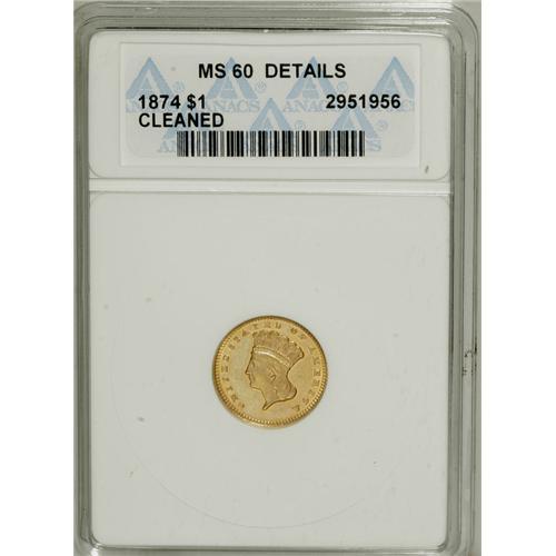 <B>1874 G$1 --Cleaned--ANACS. MS60 Details.</B></I> NGC Census: (59/2514). PCGS Population (111/2149). Mintage: 198,820. Numismedia Wsl. Price for NGC/PCGS coin in MS60: $204. (#7575)<BR><BR><b>Shipping:</b> Coins & Currency (<a target="_blank" href="http://www.heritageauctions.com/common/shipping.php">view shipping information</a>)