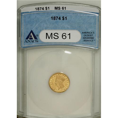 <B>1874 G$1 MS61 ANACS.</B></I> NGC Census: (436/2067). PCGS Population (292/1857). Mintage: 198,820. Numismedia Wsl. Price: $215. (#7575)<BR><BR><b>Shipping:</b> Coins & Currency (<a target="_blank" href="http://www.heritageauctions.com/common/shipping.php">view shipping information</a>)
