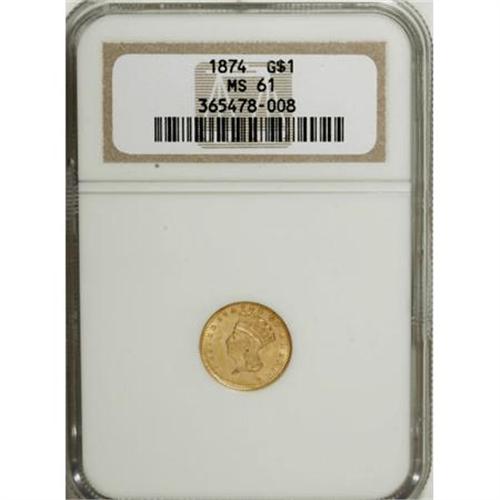 <B>1874 G$1 MS61 NGC.</B></I> NGC Census: (445/2127). PCGS Population (291/1895). Mintage: 198,820. Numismedia Wsl. Price for NGC/PCGS coin in MS61: $313. (#7575)<BR><BR><B>Coin Engraver:</B> James B. Longacre<BR><BR><b>Shipping:</b> Coins & Currency (<a target="_blank" href="http://www.heritageauctions.com/common/shipping.php">view shipping information</a>)
