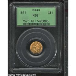 <TABLE cellSpacing=0 cellPadding=0 width="100%" bgColor=#000000 border=0><TBODY><TR><TD width="100%"><TABLE cellSpacing=1 cellPadding=3 width="100%" border=0><TBODY><TR><TD width="100%" bgColor=#79735c><FONT face=arial color=#ffffff size=3><B>Description</B> </FONT></TD></TR><TR><TD width="100%" bgColor=#ffffff><FONT face=arial size=2><B>1874 G$1 MS61 PCGS.</B></I> A lustrous and lightly abraded piece with pale gold color and untroubled surfaces. The 87 in the date is not fully struck, but the wreath is crisp.<BR><I>From the Davis Collection.</B></I> </FONT></TD></TR></TBODY></TABLE></TD></TR></TBODY></TABLE><BR><A name=PricesRealized></A><TABLE cellSpacing=0 cellPadding=0 width="100%" bgColor=#000000 border=0><TBODY><TR><TD width="100%"><TABLE cellSpacing=1 cellPadding=3 width="100%" border=0><TBODY><TR><TD width="100%" bgColor=#79735c><A name=PR><FONT face=arial color=#ffffff size=3><B>Previous Prices from Heritage Auctions</B> </FONT></A></TD></TR><TR><TD bgColor=#f6f6ed><TABLE cellSpacing=0 cellPadding=0 width="100%" border=1><TBODY><TR><TD align=middle width="33%"><B>Date</B></TD><TD align=middle width="33%"><B>Service</B></TD><TD align=middle width="33%"><B>Price</B></TD></TR><TR bgColor=whitesmoke><TD width="33%"><B>08/06/2003</B></TD><TD width="33%">PCGS</TD><TD width="33%">$288.65</TD></TR><TR bgColor=whitesmoke><TD width="33%"><B>03/21/2000</B></TD><TD width="33%">ANACS</TD><TD width="33%">$230.00</TD></TR></TBODY></TABLE></TD></TR><TR><TD bgColor=#ffffff><FONT face=arial size=1 ?>PLEASE NOTE: All prices realized reflect the final hammer price PLUS the buyer's premium in auctions that charge a buyer's premium. Each item has a notation at the top of the listing indicating whether that lot included a buyer's premium. Example: A item that sells with a final hammer price of $100 and a 20% buyer's premium will display with a price realized of $120. All information listed is intended to be as accurate as possible, but errors are possible. Please use this guide carefully and inform us of any inaccuracies. </FONT></TD></TR></TBODY></TABLE></TD></TR></TBODY></TABLE><BR><TABLE cellSpacing=0 cellPadding=0 width="100%" bgColor=#000000 border=0><TBODY><TR><TD width="100%"><TABLE cellSpacing=1 cellPadding=3 width="100%" border=0><TBODY><TR><TD width="100%" bgColor=#79735c colSpan=6><FONT face=arial color=#ffffff size=3><B>Price Guide*</B> </FONT></TD></TR><TR bgColor=#f6f6ed><TD align=middle><B>Grade</B> </TD><TD align=middle><B>Coin World<BR>(Trends)</B> </TD><TD align=middle><B>Numismedia<BR>Retail</B> </TD><TD align=middle><B>Numismedia<BR>Wholesale</B> </TD><TD align=middle><B>Coin<BR>Universe</B> </TD><TD align=middle><B>Heritage<BR>Value Index</B> </TD></TR><TR bgColor=#ffffff><TD align=middle>60</TD><TD align=right>$250.00</TD><TD align=right>$250.00</TD><TD align=right>$208.00</TD><TD align=right>$250.00</TD><TD align=right>$179.75</TD></TR><TR style="FONT-WEIGHT: bold" bgColor=#cccfdd><TD align=middle>61</TD><TD align=right>---</TD><TD align=right>$270.00</TD><TD align=right>$225.00</TD><TD align=right>---</TD><TD align=right>$231.44</TD></TR><TR bgColor=#ffffff><TD align=middle>62</TD><TD align=right>$450.00</TD><TD align=right>$420.00</TD><TD align=right>$350.00</TD><TD align=right>$410.00</TD><TD align=right>$293.13</TD></TR><TR bgColor=#ffffff><TD colSpan=6><FONT size=1>*All information listed is intended to be as accurate as possible, but errors are possible. No item may be returned or refused based on this information which is provided as a service to our customers. You should contact each pricing source directly to determine the accuracy of this information. </FONT></TD></TR></TBODY></TABLE></TD></TR></TBODY></TABLE><BR><TABLE cellSpacing=0 cellPadding=0 width="100%" bgColor=#000000 border=0><TBODY><TR><TD width="100%"><TABLE cellSpacing=1 cellPadding=3 width="100%" border=0><TBODY><TR><TD width="100%" bgColor=#79735c><FONT face=arial color=#ffffff size=3><B>Population Guide</B> </FONT></TD></TR><TR bgColor=#ffffff><TD align=middle><!-- Begin Output of Population Grid--><TABLE cellSpacing=0 cellPadding=0 width="100%" border=0><TBODY><TR><TD vAlign=center><TABLE cellSpacing=0 width="100%" border=1 cellsadding="3"><TBODY><TR><TD vAlign=center><TABLE cellSpacing=0 cellPadding=3 width="100%" border=1><TBODY><TR><TD vAlign=center align=middle bgColor=#f0f1e8 colSpan=2 <CENTER><FONT face=Arial size=2><B>PCGS Pop </B></FONT><CENTER></CENTER></TD><TD vAlign=center align=middle bgColor=#f0f1e8 colSpan=2><CENTER><FONT face=Arial size=2><B>NGC Pop</B></CENTER></FONT></TD></TR><TR><TD vAlign=center><FONT face=Arial size=2>(61)</FONT> </TD><TD vAlign=center align=right><FONT face=Arial size=2>291</FONT> </TD><TD vAlign=center><FONT face=Arial size=2>(61)</FONT> </TD><TD vAlign=center align=right><FONT face=Arial size=2>323</FONT> </TD></TR><TR><TD vAlign=center><FONT face=Arial size=2>(>61)</FONT> </TD><TD vAlign=center align=right><FONT face=Arial size=2>1598</FONT> </TD><TD vAlign=center><FONT face=Arial size=2>(>61)</FONT> </TD><TD vAlign=center align=right><FONT face=Arial size=2>1512</FONT> </TD></TR></TBODY></TABLE></TD></TR></TBODY></TABLE></TD></TR></TBODY></TABLE><!-- End Output of Population Grid--> Important notice: Heritage usually auctions material at the rate of 200-250 lots per hour. On some occasions eBay Live bid software or the Internet may not be able to keep up with the pace of the auction. We recommend placing a realistic absentee bid now as insurance to avoid disappointment. Occasionally the auctioneer may eliminate or reject an eBay Live bid, and the auctioneer may also reopen a lot after the close of the eBay live bidding (usually because we missed an audience bid), and may reject your bid even if it shows you as the winning bidder. By bidding via eBay Live, you agree that Heritage may award the lot to another bidder at its sole discretion under the circumstances described above or any other reasonable circumstances. Also please note that all Heritage lots purchase