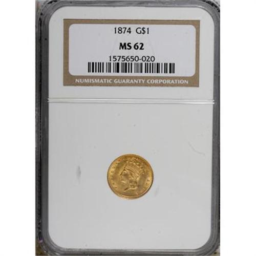 <B>1874 G$1 MS62 NGC.</B></I> NGC Census: (935/1178). PCGS Population (689/1195). Mintage: 198,820. Numismedia Wsl. Price for NGC/PCGS coin in MS62: $365. (#7575)<BR><BR><B>Coin Engraver:</B> James B. Longacre<BR><BR><b>Shipping:</b> Coins & Currency (<a target="_blank" href="http://www.heritageauctions.com/common/shipping.php">view shipping information</a>\)
