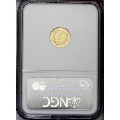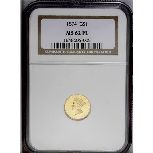 <B>1874<G$1> MS62 Prooflike NGC.</B></I> A shining example with moderately reflective fields. This orange-yellow piece has numerous small abrasions that limit the grade. Census: 4 in 62 Prooflike, 3 finer (7/06).