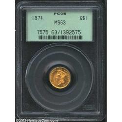 <TABLE cellSpacing=0 cellPadding=0 width="100%" bgColor=#000000 border=0><TBODY><TR><TD width="100%"><TABLE cellSpacing=1 cellPadding=3 width="100%" border=0><TBODY><TR><TD width="100%" bgColor=#79735c><FONT face=arial color=#ffffff size=3><B>Description</B> </FONT></TD></TR><TR><TD width="100%" bgColor=#ffffff><FONT face=arial size=2><B>1874 G$1 MS63 PCGS.</B></I> Semi-prooflike surfaces show with bright gold color on both sides. A pleasing Select Uncirculated piece with one abrasion on Liberty's lip and two noticeable areas on the reverse where a foreign substance presides being the only noticeable distractions. </FONT></TD></TR></TBODY></TABLE></TD></TR></TBODY></TABLE><BR><A name=PricesRealized></A><TABLE cellSpacing=0 cellPadding=0 width="100%" bgColor=#000000 border=0><TBODY><TR><TD width="100%"><TABLE cellSpacing=1 cellPadding=3 width="100%" border=0><TBODY><TR><TD width="100%" bgColor=#79735c><A name=PR><FONT face=arial color=#ffffff size=3><B>Previous Prices from Heritage Auctions</B> </FONT></A></TD></TR><TR><TD bgColor=#f6f6ed><TABLE cellSpacing=0 cellPadding=0 width="100%" border=1><TBODY><TR><TD align=middle width="33%"><B>Date</B></TD><TD align=middle width="33%"><B>Service</B></TD><TD align=middle width="33%"><B>Price</B></TD></TR><TR bgColor=whitesmoke><TD width="33%"><B>04/27/2002</B></TD><TD width="33%">PCGS</TD><TD width="33%">$690.00</TD></TR><TR bgColor=whitesmoke><TD width="33%"><B>01/07/2000</B></TD><TD width="33%">PCGS</TD><TD width="33%">$661.25</TD></TR><TR bgColor=whitesmoke><TD width="33%"><B>10/08/1994</B></TD><TD width="33%">PCGS</TD><TD width="33%">$1,210.00</TD></TR><TR bgColor=whitesmoke><TD width="33%"><B>06/01/1990</B></TD><TD width="33%">PCGS</TD><TD width="33%">$1,430.00</TD></TR><TR bgColor=whitesmoke><TD width="33%"><B>05/01/1990</B></TD><TD width="33%">PCGS</TD><TD width="33%">$1,540.00</TD></TR><TR bgColor=whitesmoke><TD width="33%"><B>02/03/1993</B></TD><TD width="33%">NGC</TD><TD width="33%">$825.00</TD></TR><TR bgColor=whitesmoke><TD width="33%"><B>01/10/1998</B></TD><TD width="33%">NGC</TD><TD width="33%">$891.25</TD></TR><TR bgColor=whitesmoke><TD width="33%"><B>08/06/2003</B></TD><TD width="33%">NGC</TD><TD width="33%">$603.75</TD></TR></TBODY></TABLE></TD></TR><TR><TD bgColor=#ffffff><FONT face=arial size=1 ?>PLEASE NOTE: All prices realized reflect the final hammer price PLUS the buyer's premium in auctions that charge a buyer's premium. Each item has a notation at the top of the listing indicating whether that lot included a buyer's premium. Example: A item that sells with a final hammer price of $100 and a 20% buyer's premium will display with a price realized of $120. All information listed is intended to be as accurate as possible, but errors are possible. Please use this guide carefully and inform us of any inaccuracies. </FONT></TD></TR></TBODY></TABLE></TD></TR></TBODY></TABLE><BR><TABLE cellSpacing=0 cellPadding=0 width="100%" bgColor=#000000 border=0><TBODY><TR><TD width="100%"><TABLE cellSpacing=1 cellPadding=3 width="100%" border=0><TBODY><TR><TD width="100%" bgColor=#79735c colSpan=6><FONT face=arial color=#ffffff size=3><B>Price Guide*</B> </FONT></TD></TR><TR bgColor=#f6f6ed><TD align=middle><B>Grade</B> </TD><TD align=middle><B>Coin World<BR>(Trends)</B> </TD><TD align=middle><B>Numismedia<BR>Retail</B> </TD><TD align=middle><B>Numismedia<BR>Wholesale</B> </TD><TD align=middle><B>Coin<BR>Universe</B> </TD><TD align=middle><B>Heritage<BR>Value Index</B> </TD></TR><TR bgColor=#ffffff><TD align=middle>62</TD><TD align=right>$450.00</TD><TD align=right>$420.00</TD><TD align=right>$350.00</TD><TD align=right>$410.00</TD><TD align=right>$293.13</TD></TR><TR style="FONT-WEIGHT: bold" bgColor=#cccfdd><TD align=middle>63</TD><TD align=right>$900.00</TD><TD align=right>---</TD><TD align=right>$865.00</TD><TD align=right>$1,050.00</TD><TD align=right>$740.50</TD></TR><TR bgColor=#ffffff><TD align=middle>64</TD><TD align=right>$950.00</TD><TD align=right>---</TD><TD align=right>$935.00</TD><TD align=right>$1,175.00</TD><TD align=right>$810.63</TD></TR><TR bgColor=#ffffff><TD colSpan=6><FONT size=1>*All information listed is intended to be as accurate as possible, but errors are possible. No item may be returned or refused based on this information which is provided as a service to our customers. You should contact each pricing source directly to determine the accuracy of this information. </FONT></TD></TR></TBODY></TABLE></TD></TR></TBODY></TABLE><BR><TABLE cellSpacing=0 cellPadding=0 width="100%" bgColor=#000000 border=0><TBODY><TR><TD width="100%"><TABLE cellSpacing=1 cellPadding=3 width="100%" border=0><TBODY><TR><TD width="100%" bgColor=#79735c><FONT face=arial color=#ffffff size=3><B>Population Guide</B> </FONT></TD></TR><TR bgColor=#ffffff><TD align=middle><!-- Begin Output of Population Grid--><TABLE cellSpacing=0 cellPadding=0 width="100%" border=0><TBODY><TR><TD vAlign=center><TABLE cellSpacing=0 width="100%" border=1 cellsadding="3"><TBODY><TR><TD vAlign=center><TABLE cellSpacing=0 cellPadding=3 width="100%" border=1><TBODY><TR><TD vAlign=center align=middle bgColor=#f0f1e8 colSpan=2 <CENTER><FONT face=Arial size=2><B>PCGS Pop </B></FONT><CENTER></CENTER></TD><TD vAlign=center align=middle bgColor=#f0f1e8 colSpan=2><CENTER><FONT face=Arial size=2><B>NGC Pop</B></CENTER></FONT></TD></TR><TR><TD vAlign=center><FONT face=Arial size=2>(63)</FONT> </TD><TD vAlign=center align=right><FONT face=Arial size=2>539</FONT> </TD><TD vAlign=center><FONT face=Arial size=2>(63)</FONT> </TD><TD vAlign=center align=right><FONT face=Arial size=2>425</FONT> </TD></TR><TR><TD vAlign=center><FONT face=Arial size=2>(>63)</FONT> </TD><TD vAlign=center align=right><FONT face=Arial size=2>455</FONT> </TD><TD vAlign=center><FONT face=Arial size=2>(>63)</FONT> </TD><TD vAlign=center align=right><FONT face=Arial size=2>440</FONT> </TD></TR></TBODY></TABLE></TD></TR></TBODY></TABLE></TD></TR></TBODY></TABLE><!-- End Output of Population Grid--> Important n
