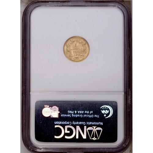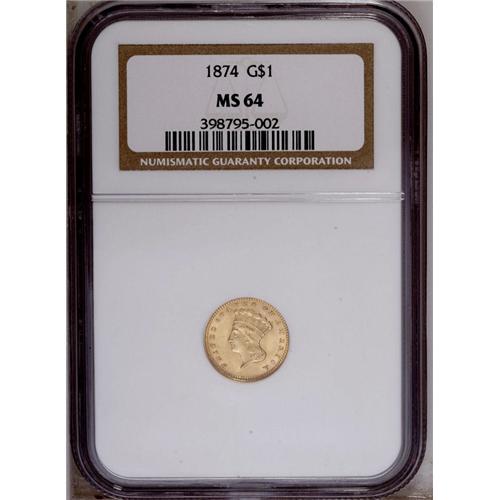 <B>1874 G$1 MS64 NGC.</B></I> An evenly struck and fully lustrous near-Gem with clean surfaces and good eye appeal. The 1 in the date is lightly repunched.