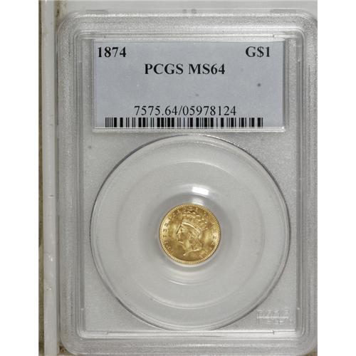 <B>1874 G$1 MS64 PCGS.</B></I> Fresh, original luster is the defining characteristic of this captivating yellow-gold piece. The strike and surface quality are pleasing as well.<BR><BR><b>Shipping:</b> Coins & Currency (<a target="_blank" href="http://www.heritageauctions.com/common/shipping.php">view shipping information</a>)