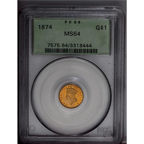 <B>1874 G$1 MS64 PCGS.</B></I> Lemon and lilac tints adorn this lustrous older holder near-Gem. A hint of striking incompletion on the denomination and date; nonetheless attractive for the grade.