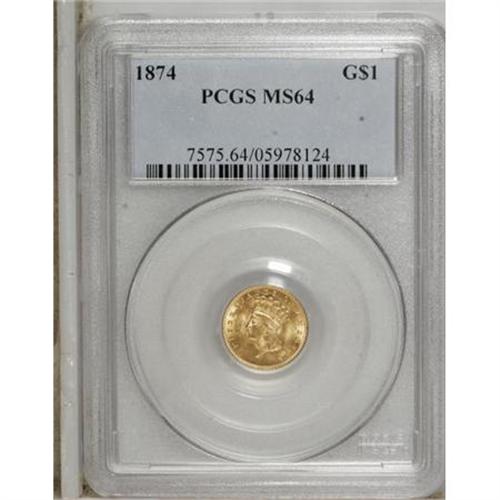 <B>1874 G$1 MS64 PCGS.</B></I> Fresh, original luster is the defining characteristic of this captivating yellow-gold piece, one that hails from the highest-mintage issue of the 1870s. The strike and surface quality are pleasing as well. A lovely candidate for a type collection.<BR><BR><b>Shipping:</b> Coins & Currency (<a target="_blank" href="http://www.heritageauctions.com/common/shipping.php">view shipping information</a>)
