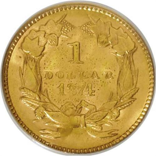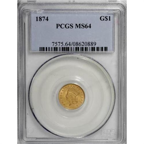 <B>1874 G$1 MS64 PCGS.</B></I> PCGS Population (398/179). NGC Census: (390/187). Mintage: 198,820. Numismedia Wsl. Price for NGC/PCGS coin in MS64: $860. (#7575)<BR><BR><B>Coin Engraver:</B> James B. Longacre<BR><BR><b>Shipping:</b> Coins & Currency (<a target="_blank" href="http://www.heritageauctions.com/common/shipping.php">view shipping information</a>\)