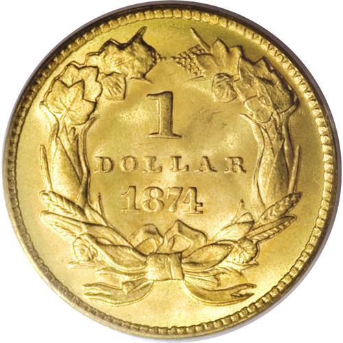 <B>1874 G$1 MS66 PCGS.</B></I> This Premium Gem displays satiny peach-gold luster with traces of mint-green. Generally well defined, except that nearly all of the letters in LIBERTY are missing, which is typical for this issue and is a feature of the die. A few minor luster grazes do not distract. Population: 39 in 66, 27 finer (4/07).<BR><BR><b>Shipping:</b> Coins & Currency (<a target="_blank" href="http://www.heritageauctions.com/common/shipping.php">view shipping information</a>)