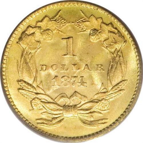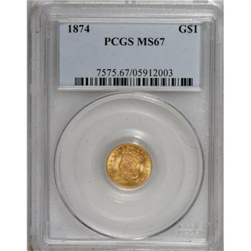 <B>1874 G$1 MS67 PCGS.</B></I> Breen-6094. Peach toning occasionally cedes to lime tints. An extraordinary Superb Gem whose lustrous fields and devices are bereft of visible marks. The overall strike is good, but minor incompleteness is noted on the 8 in the date and the I in UNITED. Most of LIBERTY was lapped from the die prior to the strike. Population: 29 in 67, 0 finer (8/07).<BR><BR><B>Coin Engraver:</B> James B. Longacre<BR><BR><b>Shipping:</b> Coins & Currency (<a target="_blank" href="http://www.heritageauctions.com/common/shipping.php">view shipping information</a>)
