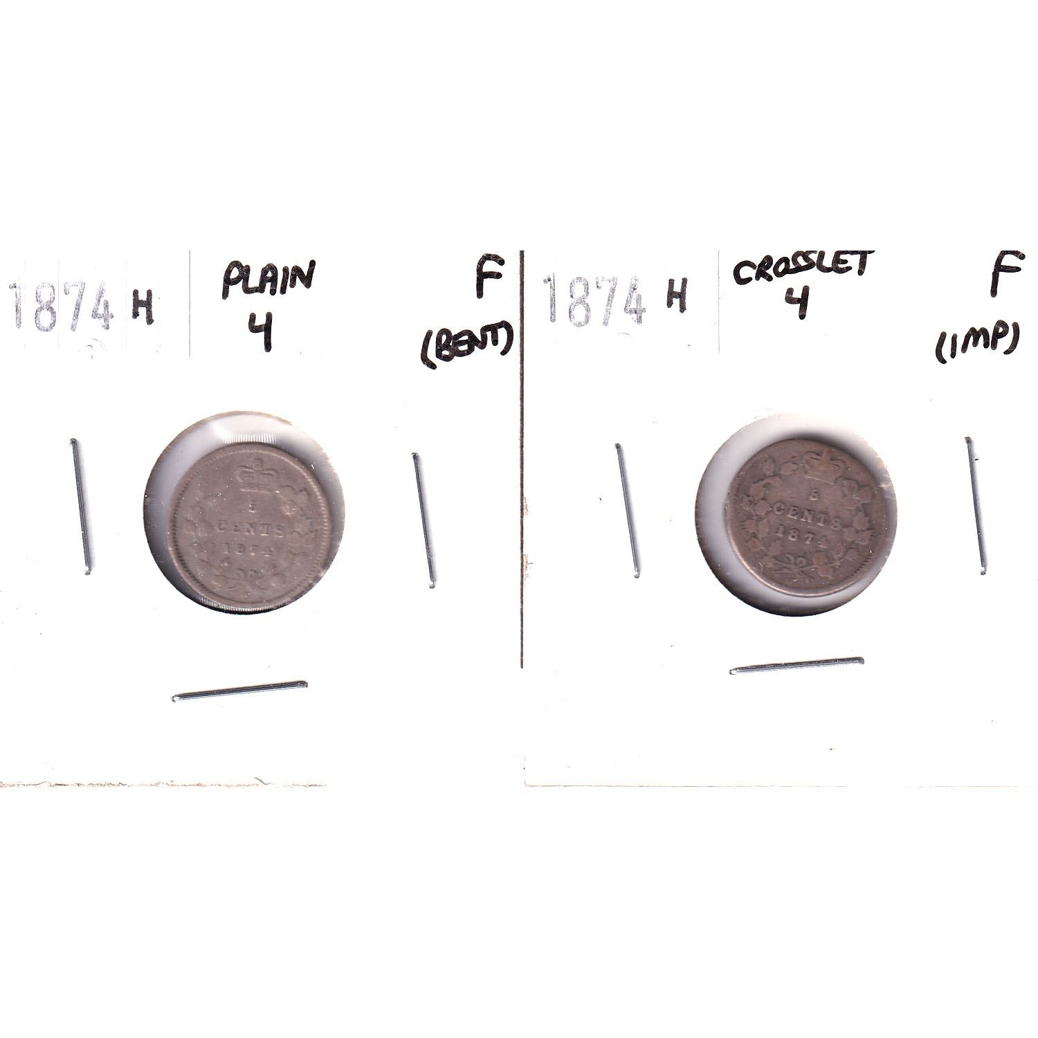 1874-H Crosslet & Plain 4 5-cent Fine (Impaired/Bent). 2pcs