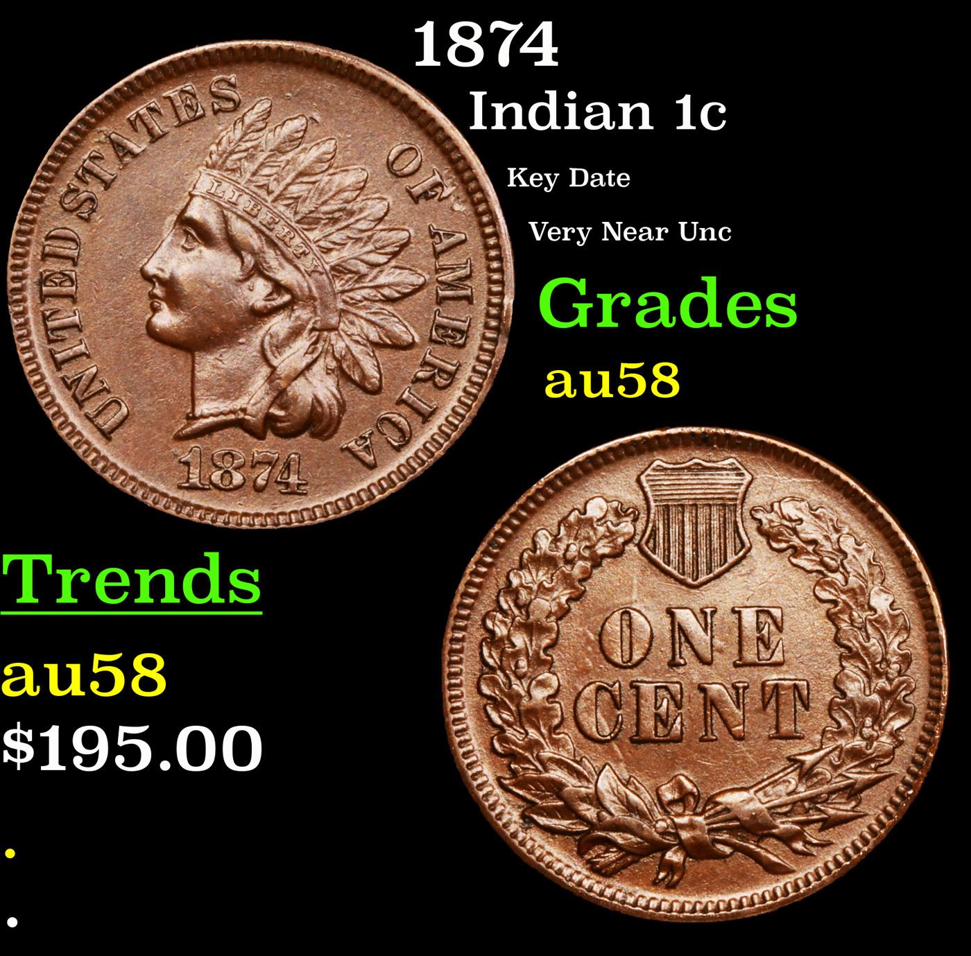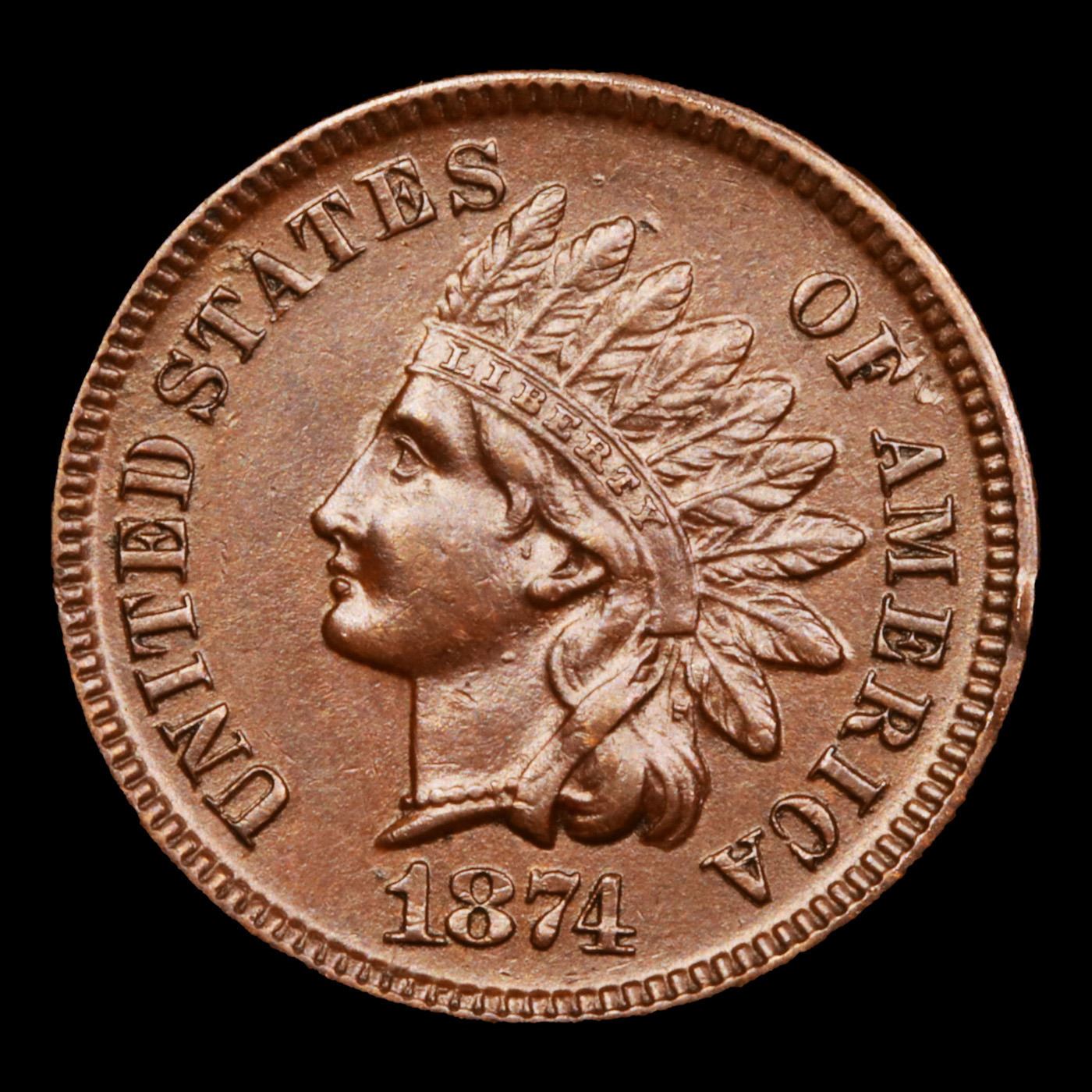 1874 Indian Cent 1c Grades Choice AU/BU Slider. According to Jaime Hernandez from PCGS, The 1874 Indian Cent is somewhat of a scarcer issue. Semi key date that in circulated grades carries a premium over the type coins in the series. With an original mintage of over 14.2 million; PCGS estimated that only 6000 survive in all grades.