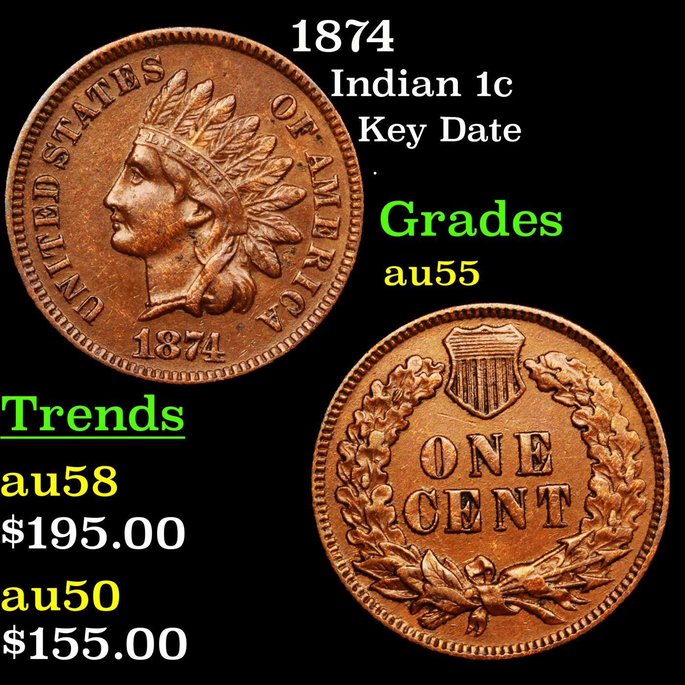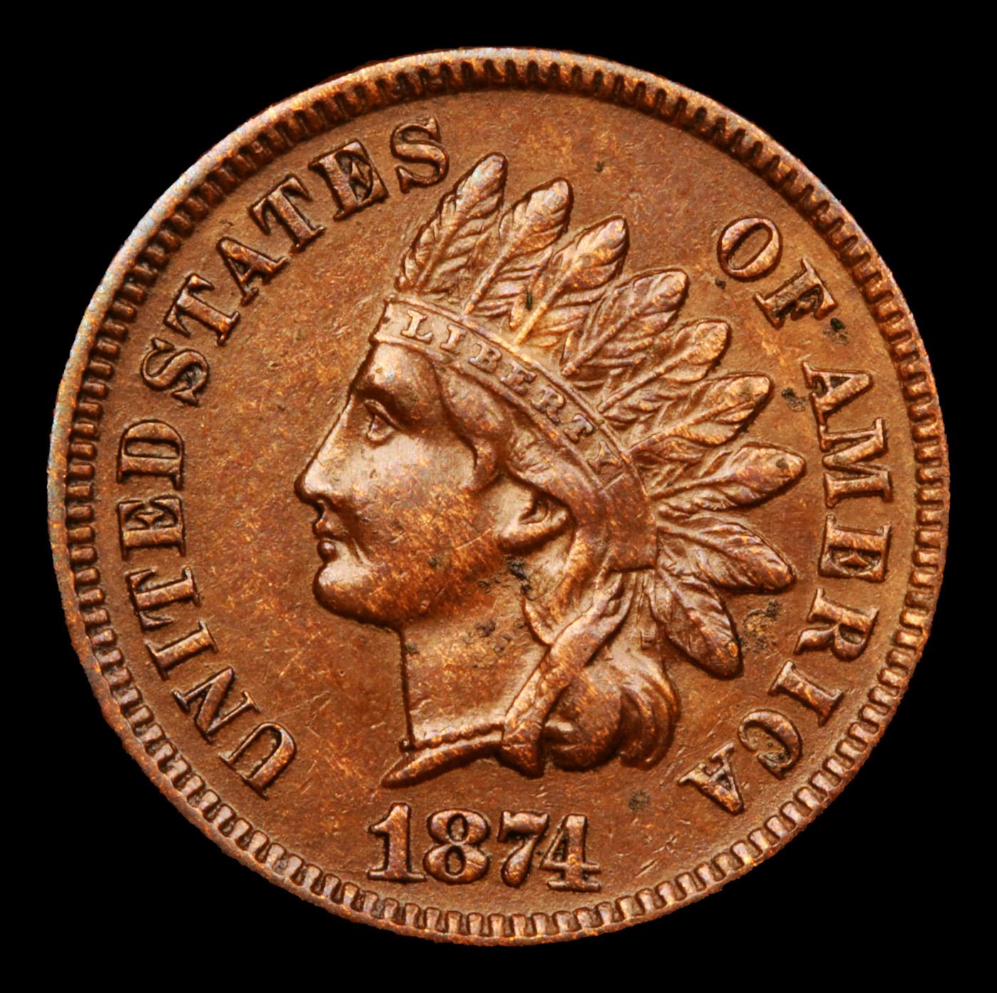 1874 Indian Cent 1c Grades Choice AU.  According to Jaime Hernandez from PCGS, The 1874 Indian Cent is somewhat of a scarcer issue.  Semi key date that in circulated grades carries a premium over the type coins in the series.  With an original mintage of over 14.2 million; PCGS estimated that only 6000 survive in all grades.