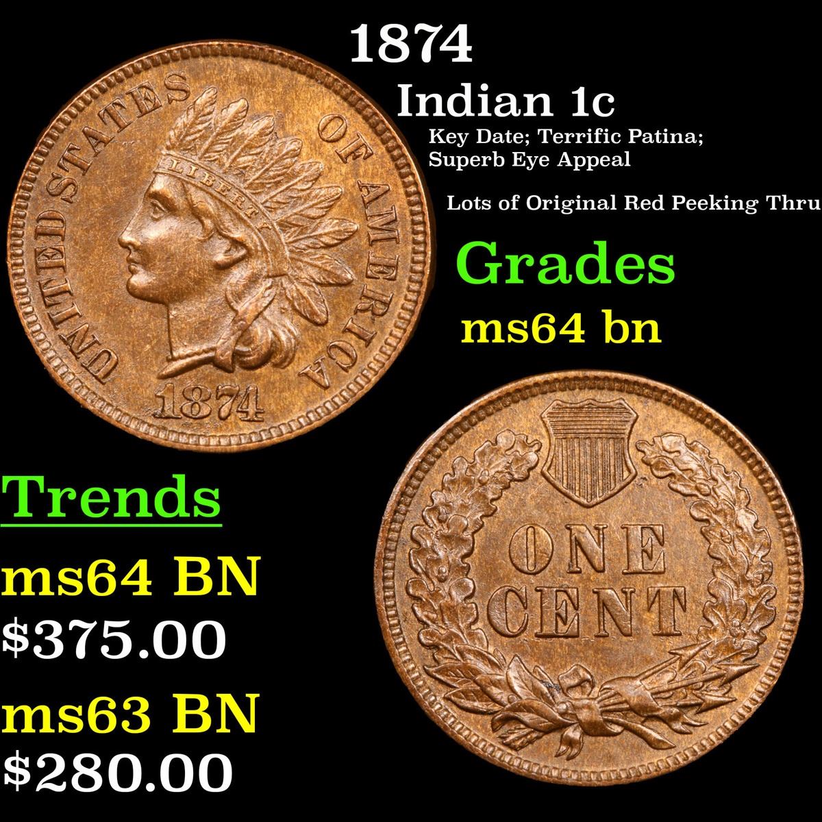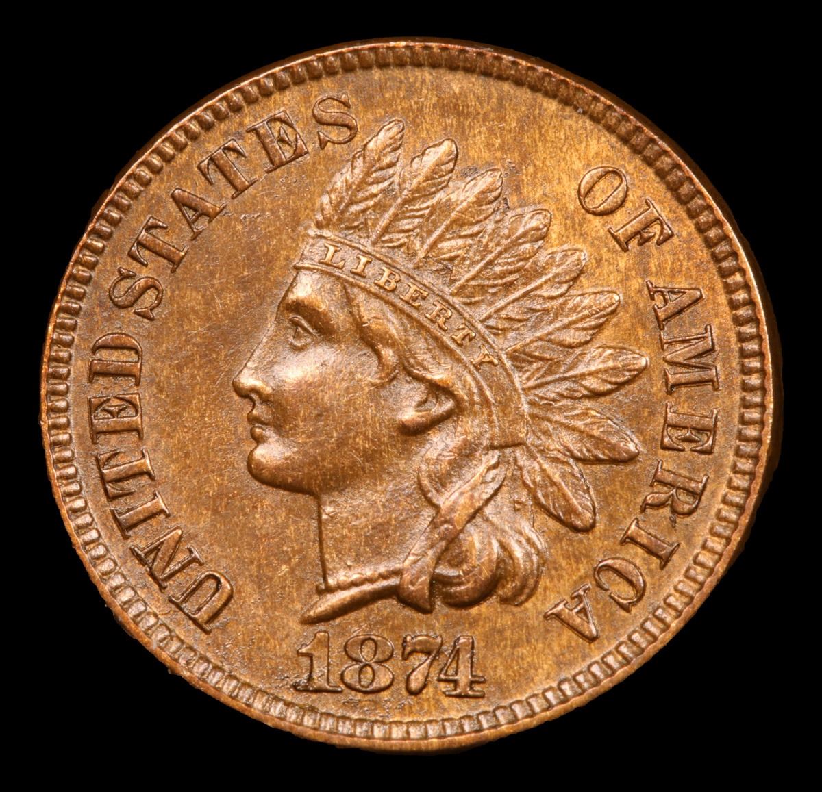 1874 Indian Cent 1c Grades Choice Unc BN. According to Jaime Hernandez from PCGS, The 1874 Indian Cent is somewhat of a scarcer issue. Semi key date that in circulated grades carries a premium over the type coins in the series. With an original mintage of over 14.2 million; PCGS estimated that only 6000 survive in all grades.