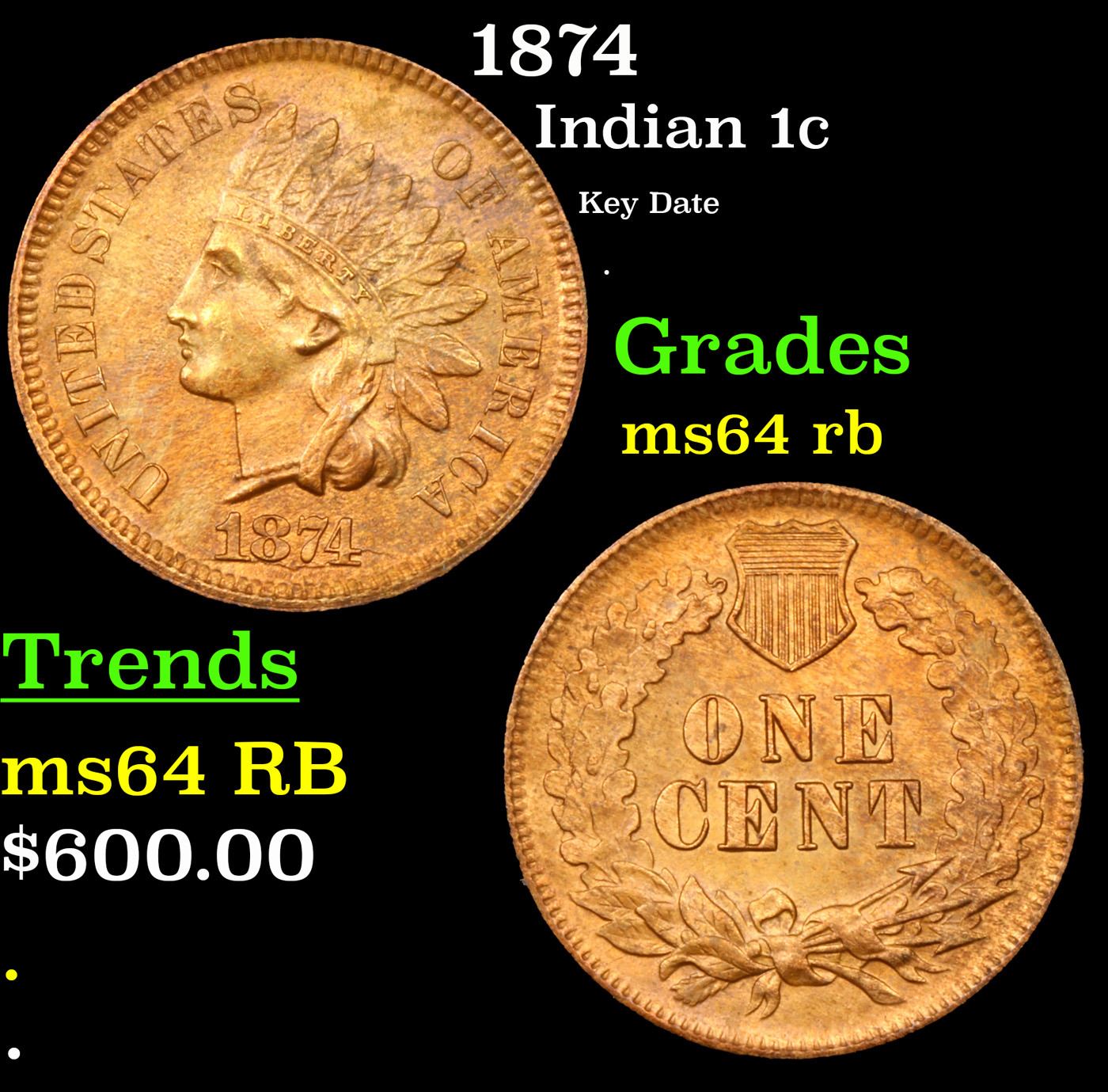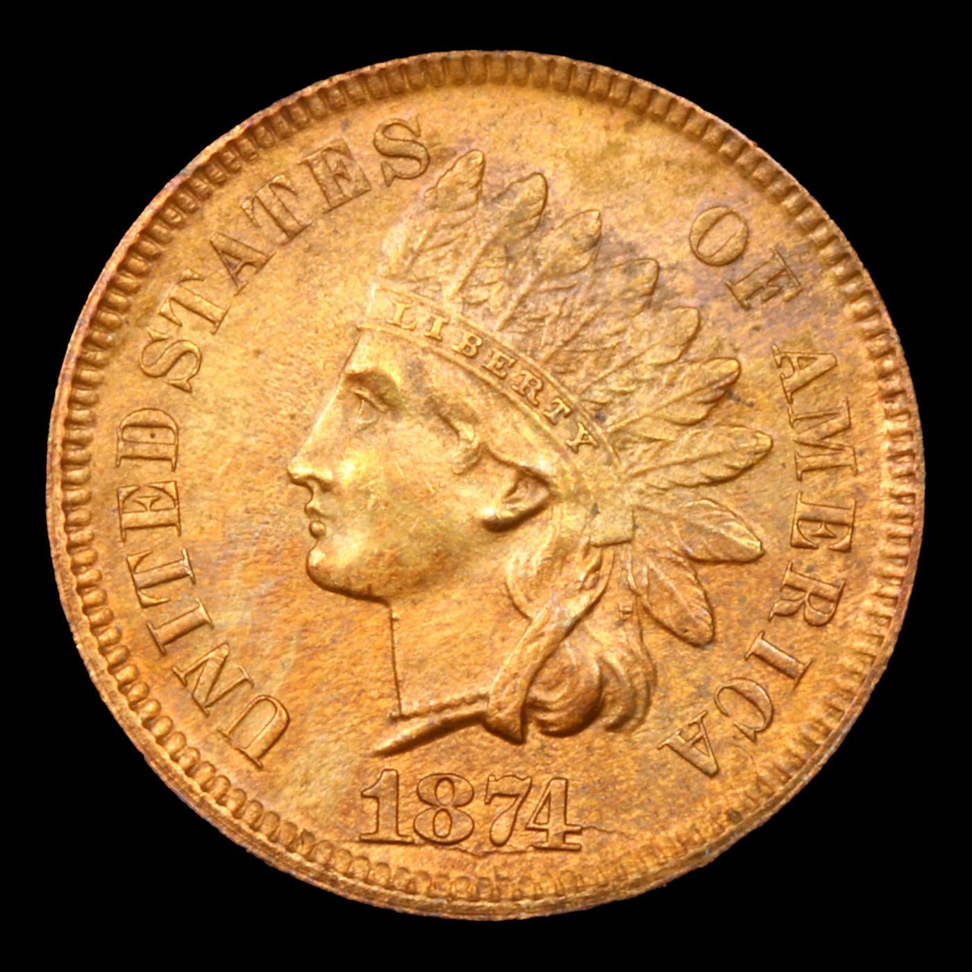 1874 Indian Cent 1c Grades Choice Unc RB. According to Jaime Hernandez from PCGS, The 1874 Indian Cent is somewhat of a scarcer issue. Semi key date that in circulated grades carries a premium over the type coins in the series. With an original mintage of over 14.2 million; PCGS estimated that only 6000 survive in all grades.