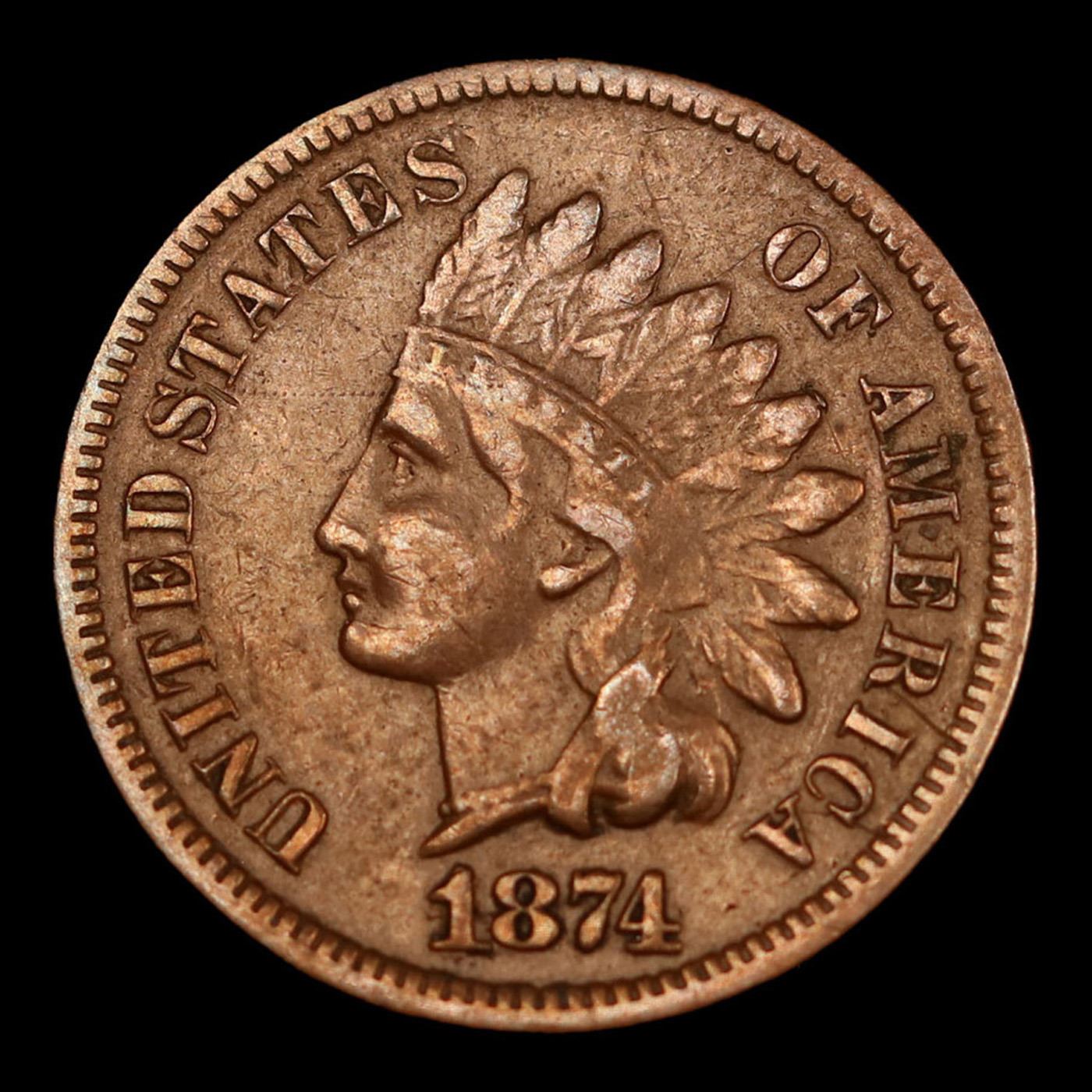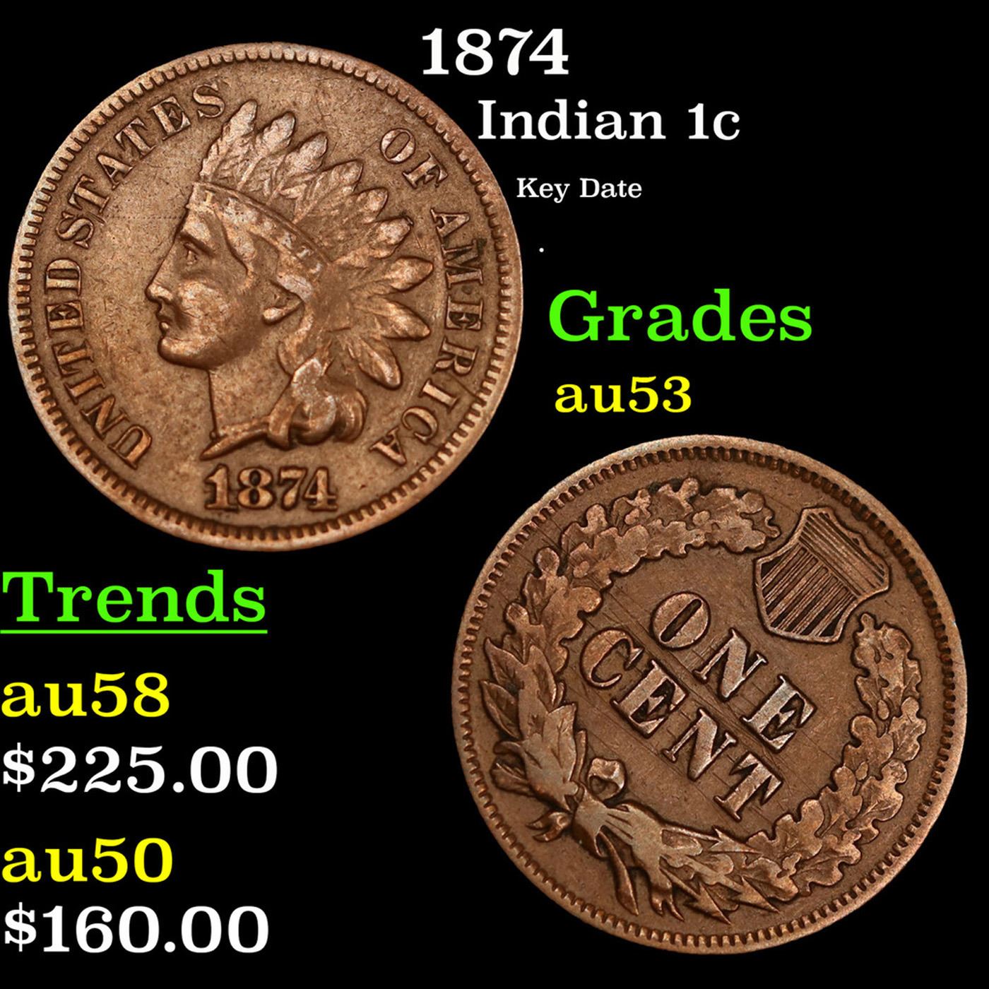 1874 Indian Cent 1c Grades Select AU. According to Jaime Hernandez from PCGS, The 1874 Indian Cent is somewhat of a scarcer issue. Semi key date that in circulated grades carries a premium over the type coins in the series. With an original mintage of over 14.2 million; PCGS estimated that only 6000 survive in all grades.