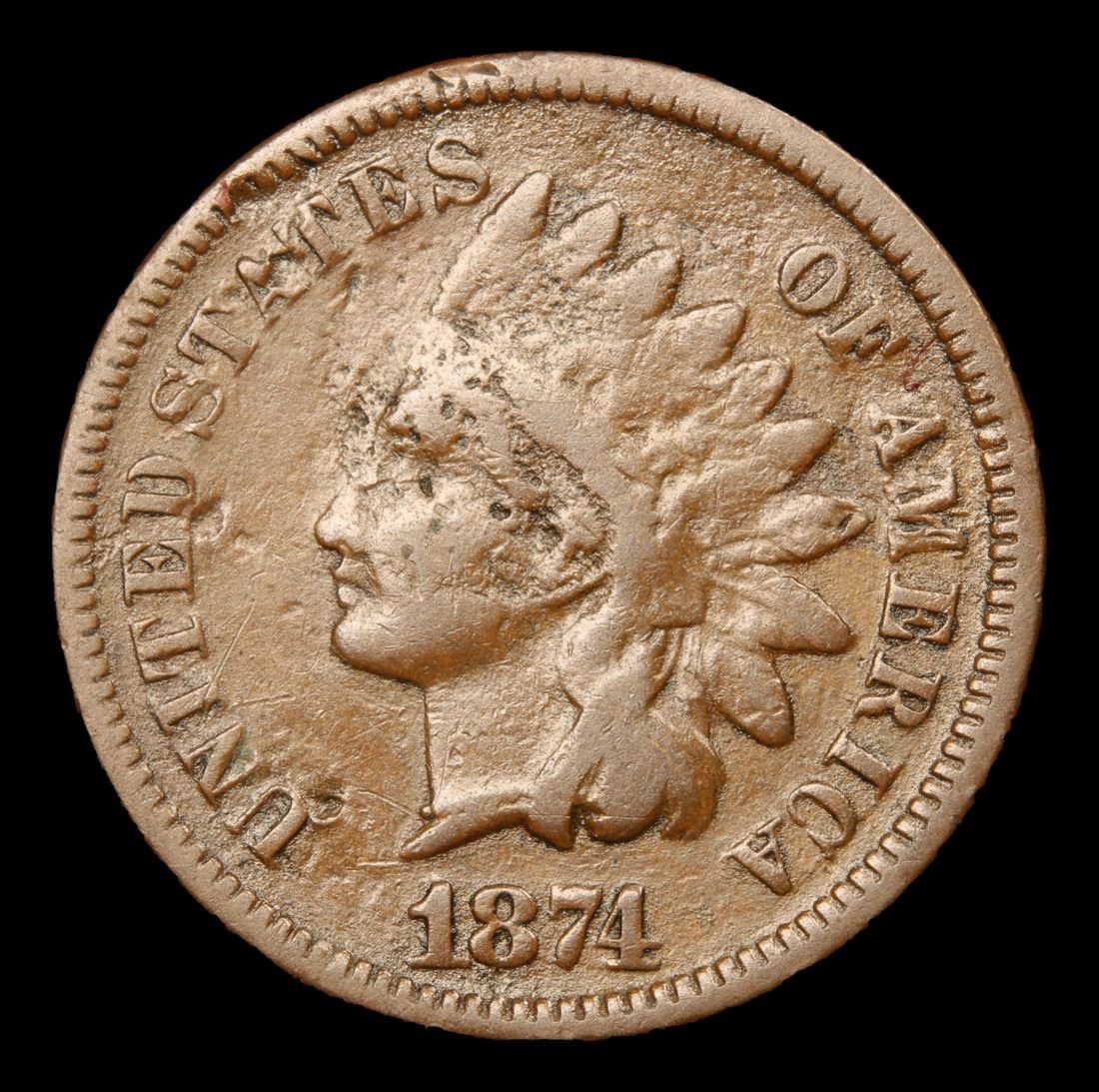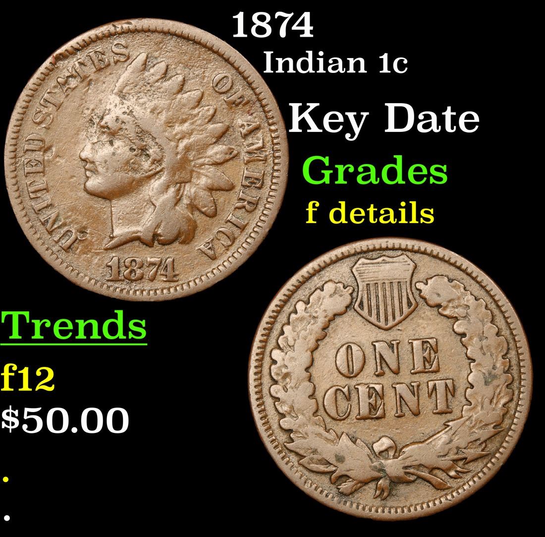 1874 Key Date . Indian Cent 1c Grades f details. According to Jaime Hernandez from PCGS, The 1874 Indian Cent is somewhat of a scarcer issue. Semi key date that in circulated grades carries a premium over the type coins in the series. With an original mintage of over 14.2 million; PCGS estimated that only 6000 survive in all grades.