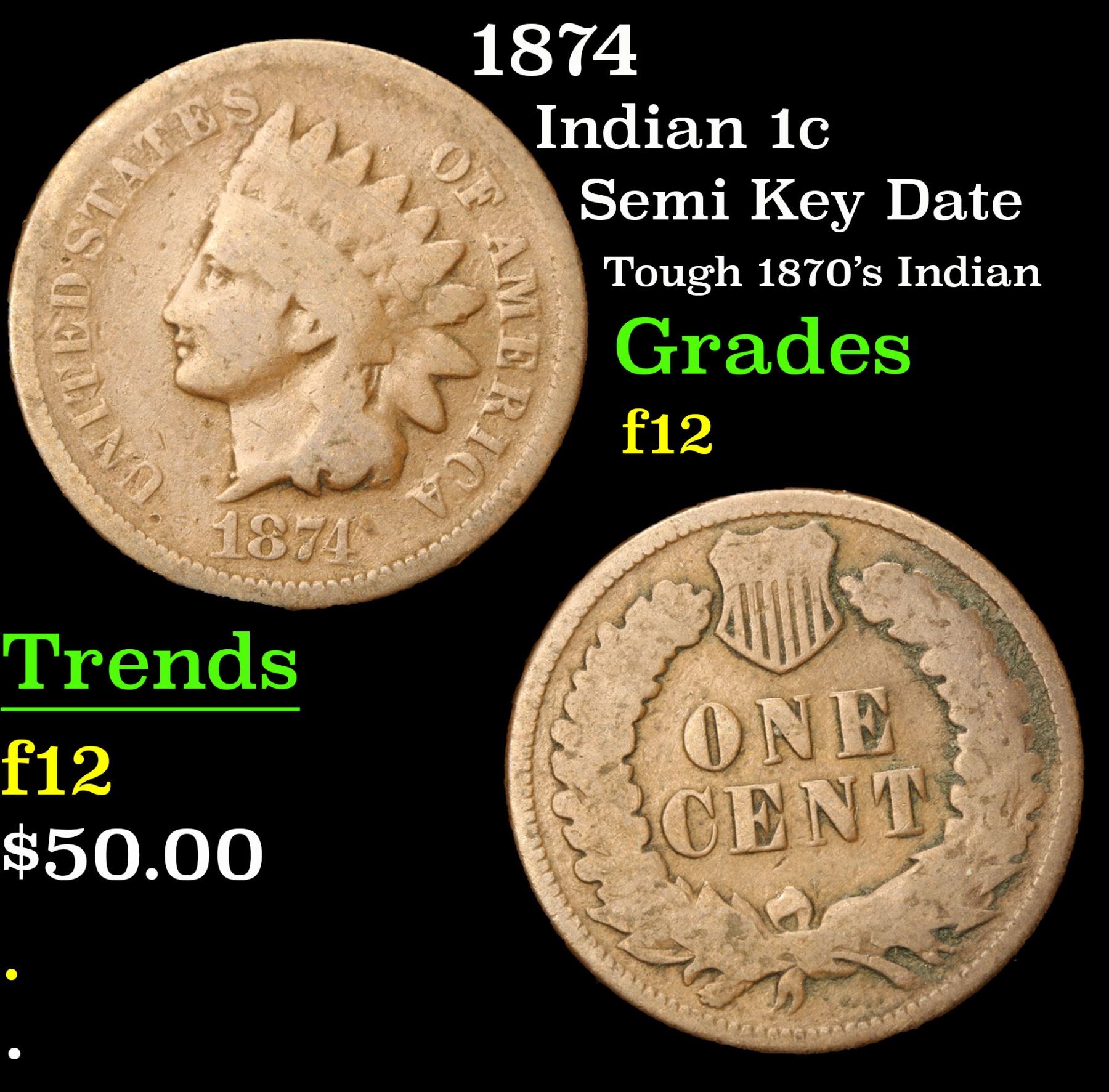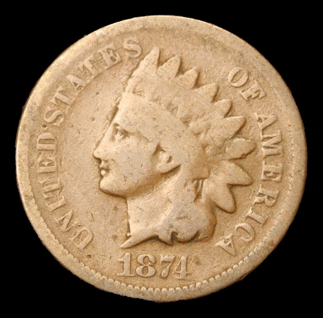 1874 Indian Cent 1c Grades f, fine. According to Jaime Hernandez from PCGS, The 1874 Indian Cent is somewhat of a scarcer issue. Semi key date that in circulated grades carries a premium over the type coins in the series. With an original mintage of over 14.2 million; PCGS estimated that only 6000 survive in all grades. Semi Key Date; Tough 1870's Indian