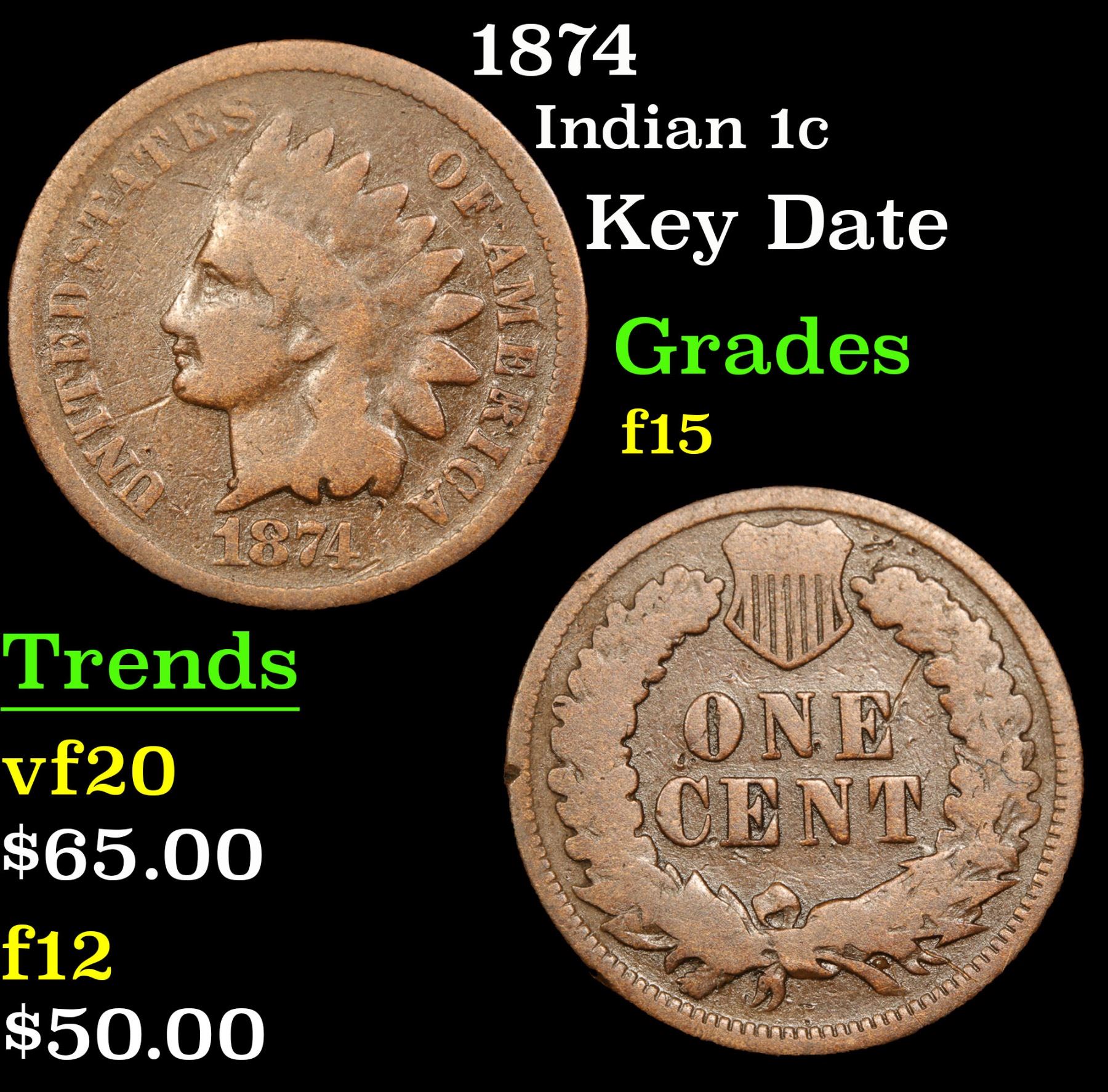 1874 Indian Cent 1c Grades f+. Key Date According to Jaime Hernandez from PCGS, The 1874 Indian Cent is somewhat of a scarcer issue. Semi key date that in circulated grades carries a premium over the type coins in the series. With an original mintage of over 14.2 million; PCGS estimated that only 6000 survive in all grades.
