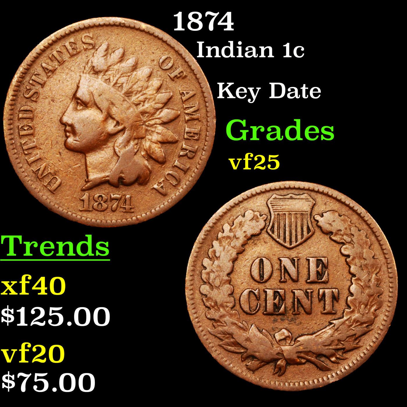 1874 Indian Cent 1c Grades vf+. According to Jaime Hernandez from PCGS, The 1874 Indian Cent is somewhat of a scarcer issue. Semi key date that in circulated grades carries a premium over the type coins in the series. With an original mintage of over 14.2 million; PCGS estimated that only 6000 survive in all grades.