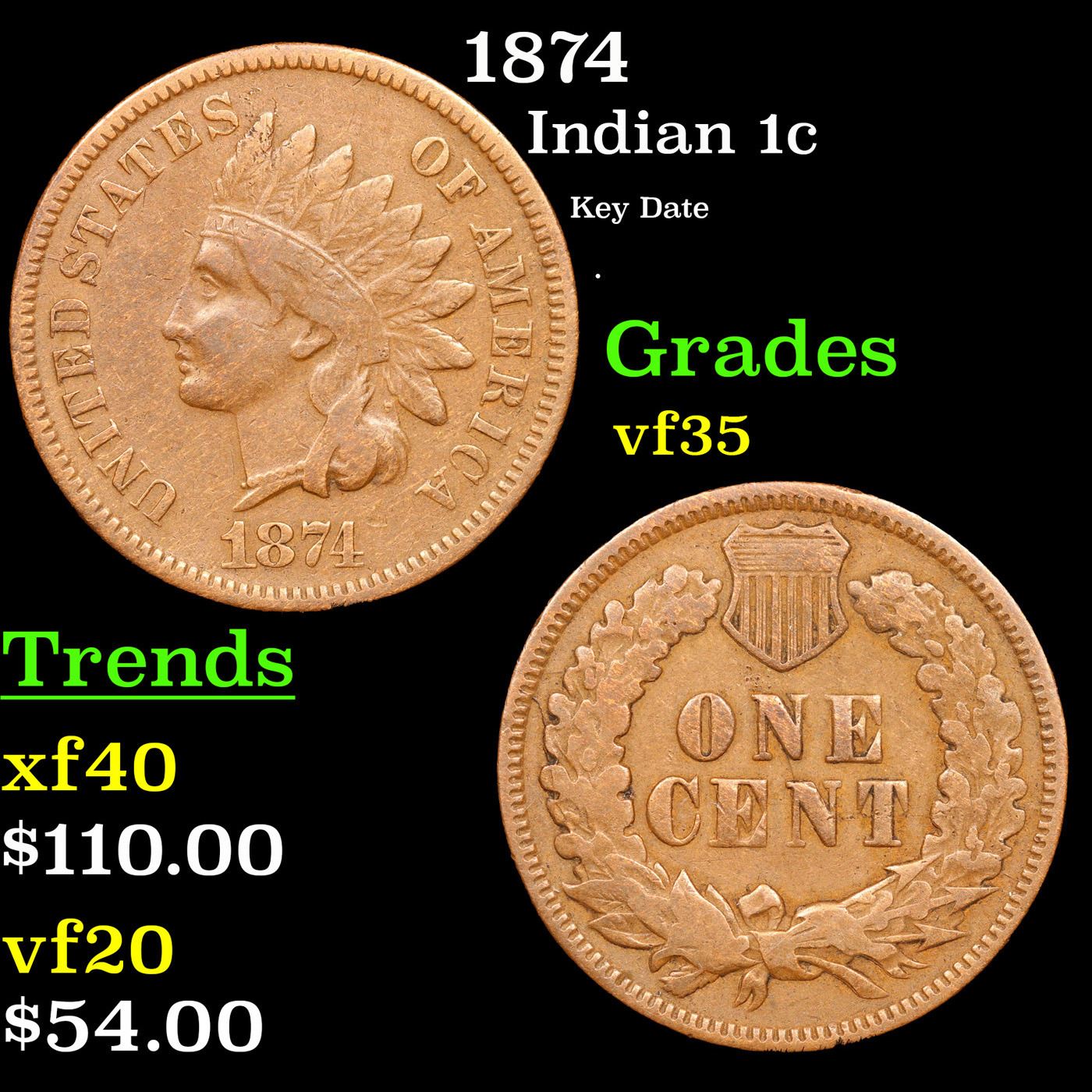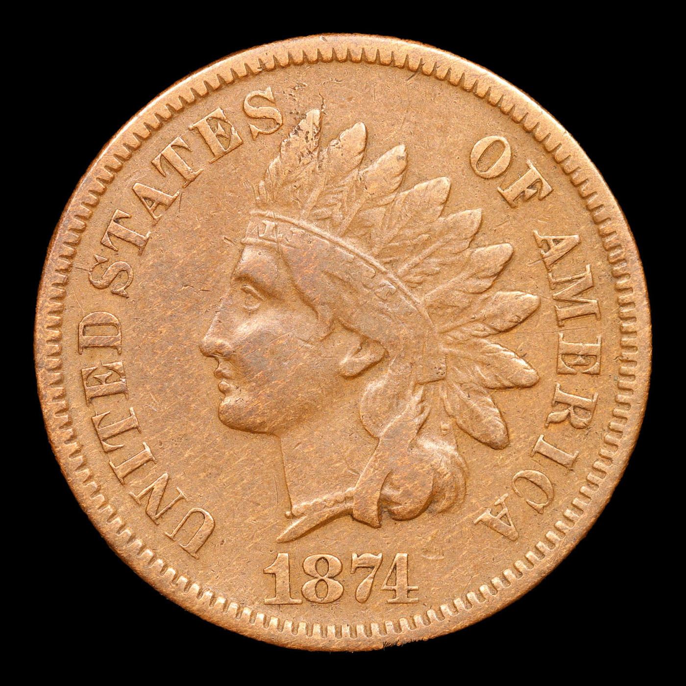 1874 Indian Cent 1c Grades vf++. According to Jaime Hernandez from PCGS, The 1874 Indian Cent is somewhat of a scarcer issue. Semi key date that in circulated grades carries a premium over the type coins in the series. With an original mintage of over 14.2 million; PCGS estimated that only 6000 survive in all grades.