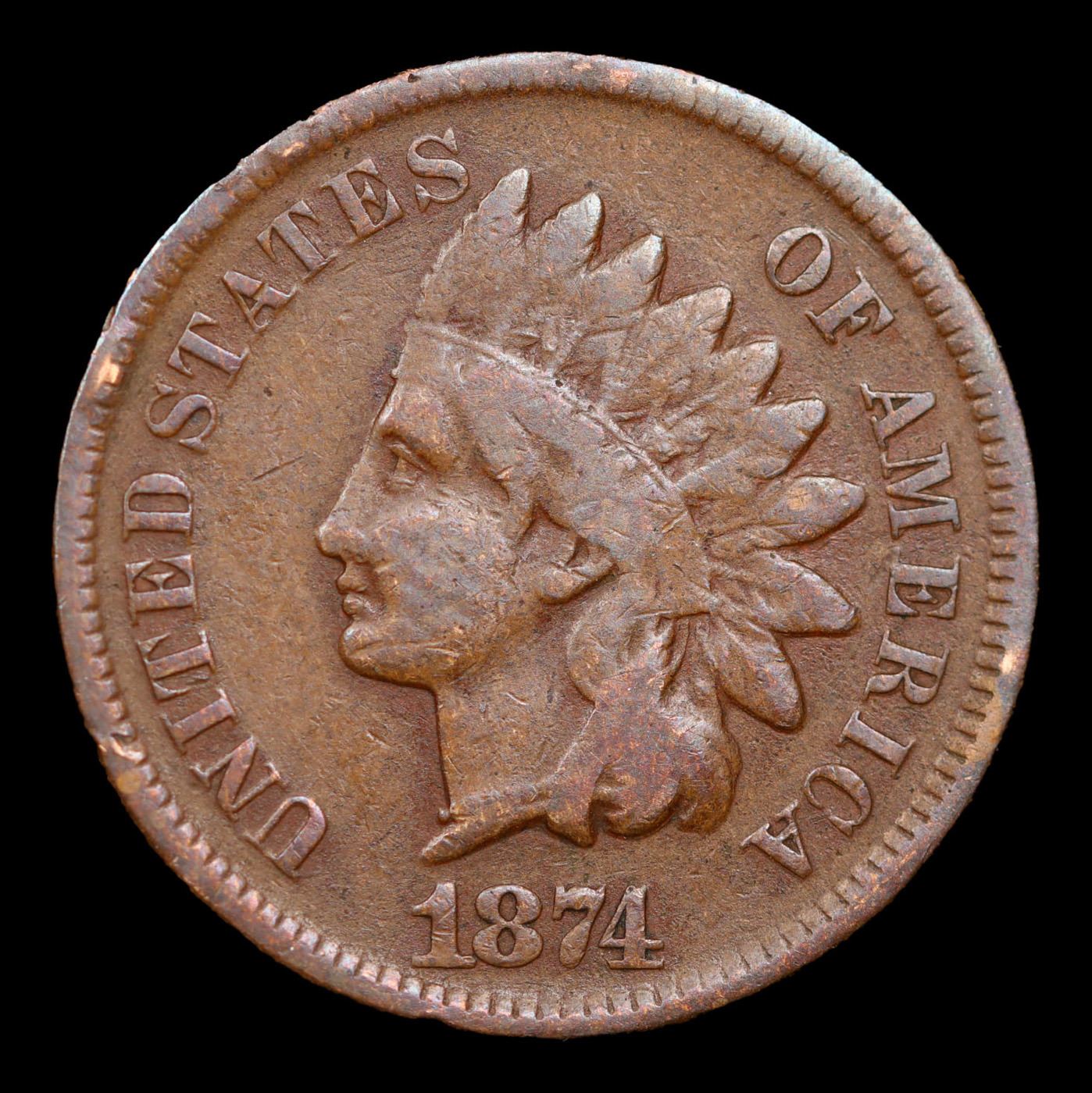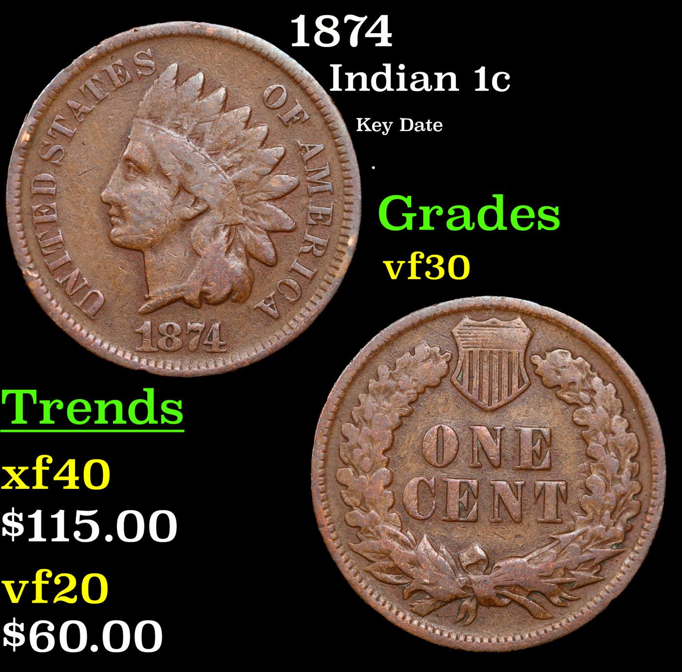 1874 Indian Cent 1c Grades vf++. According to Jaime Hernandez from PCGS, The 1874 Indian Cent is somewhat of a scarcer issue. Semi key date that in circulated grades carries a premium over the type coins in the series. With an original mintage of over 14.2 million; PCGS estimated that only 6000 survive in all grades.