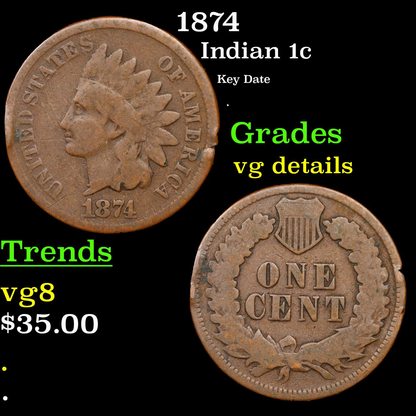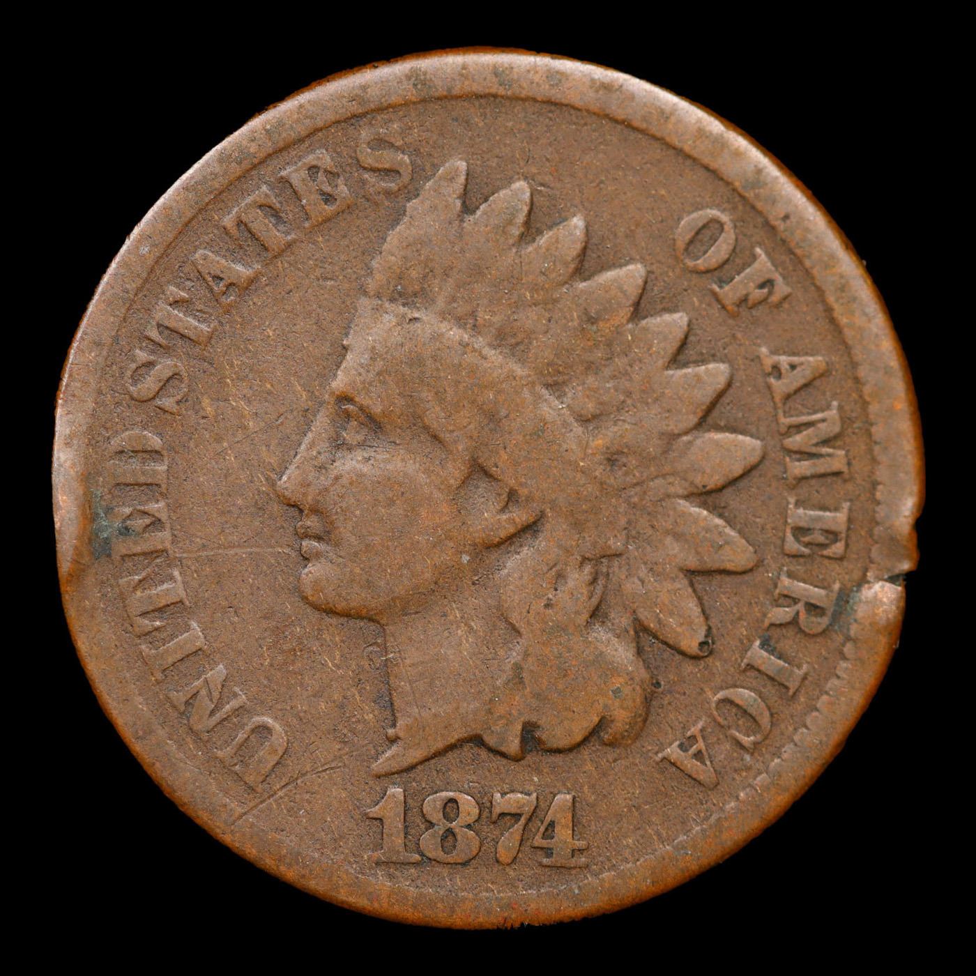1874 Indian Cent 1c Grades vg details. According to Jaime Hernandez from PCGS, The 1874 Indian Cent is somewhat of a scarcer issue. Semi key date that in circulated grades carries a premium over the type coins in the series. With an original mintage of over 14.2 million; PCGS estimated that only 6000 survive in all grades.