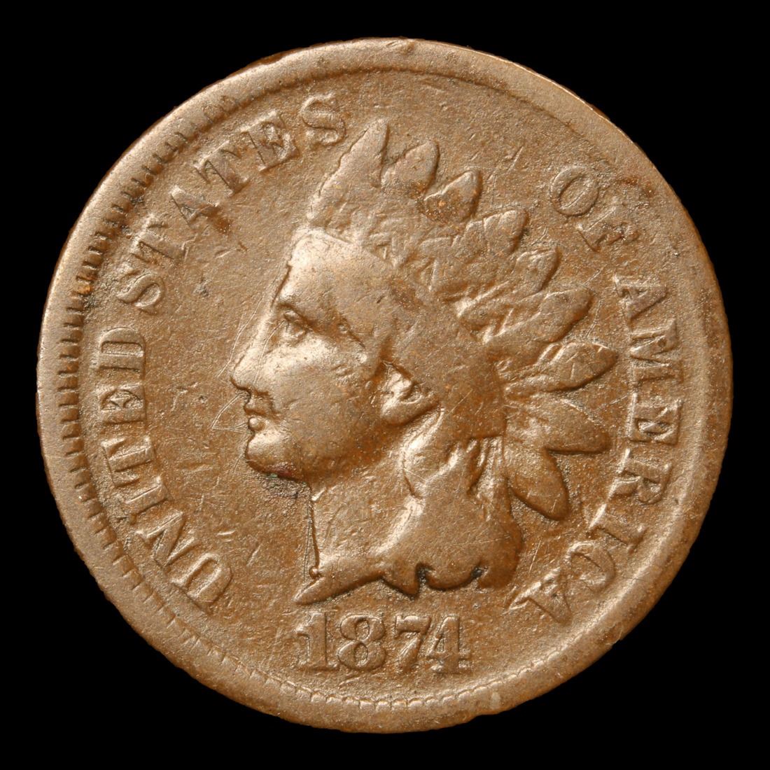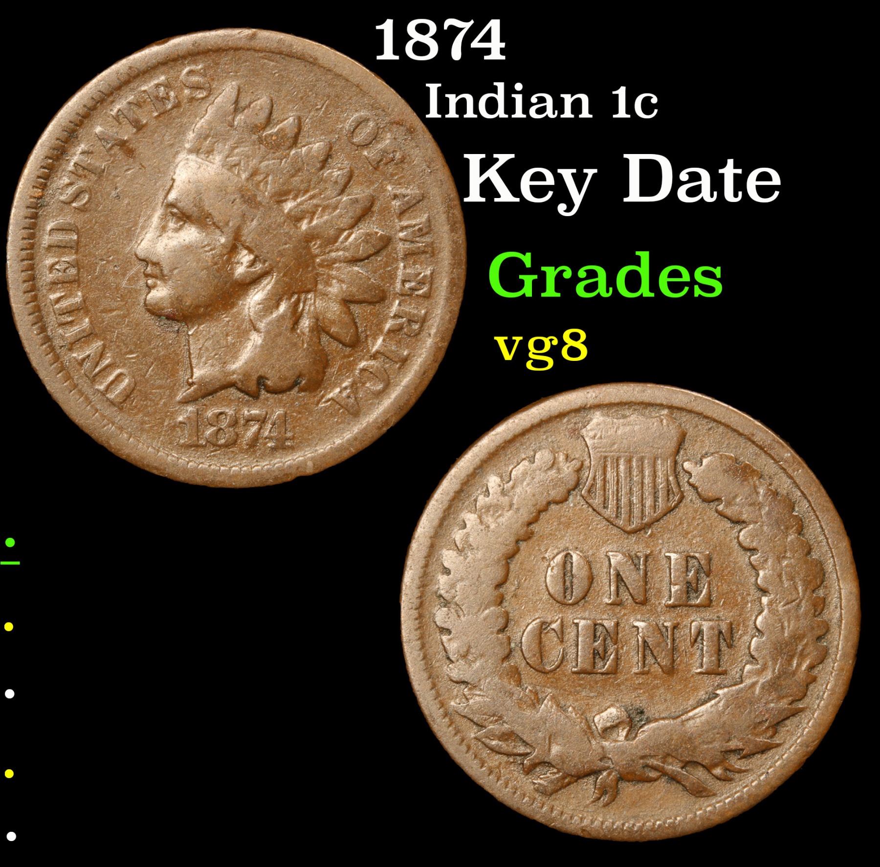 1874 Indian Cent 1c Grades vg, very good. According to Jaime Hernandez from PCGS, The 1874 Indian Cent is somewhat of a scarcer issue. Semi key date that in circulated grades carries a premium over the type coins in the series. With an original mintage of over 14.2 million; PCGS estimated that only 6000 survive in all grades. Key Date
