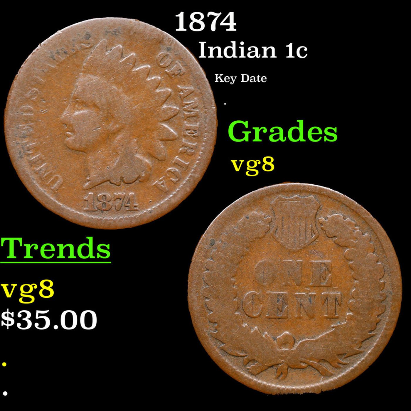1874 Indian Cent 1c Grades vg, very good. According to Jaime Hernandez from PCGS, The 1874 Indian Cent is somewhat of a scarcer issue. Semi key date that in circulated grades carries a premium over the type coins in the series. With an original mintage of over 14.2 million; PCGS estimated that only 6000 survive in all grades.