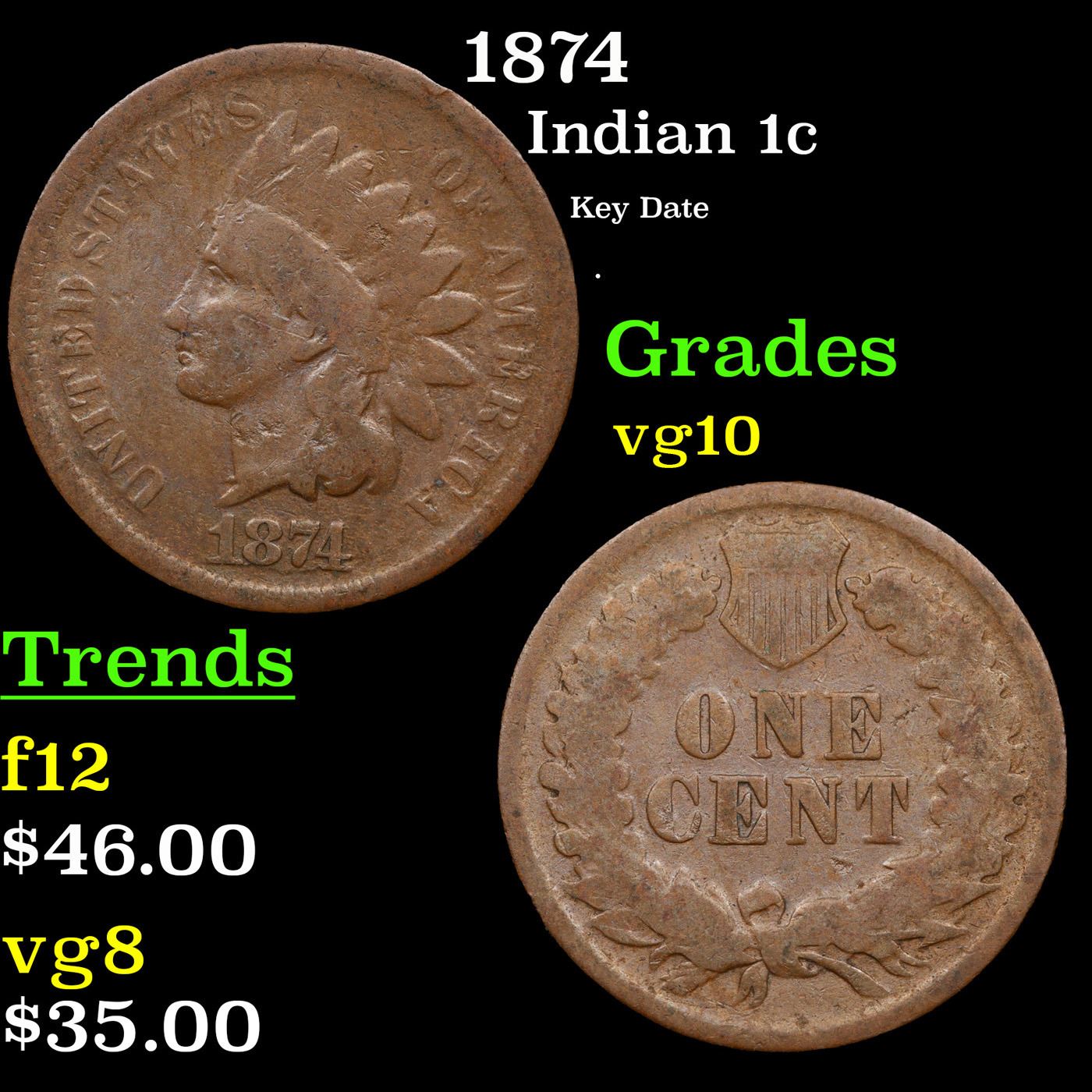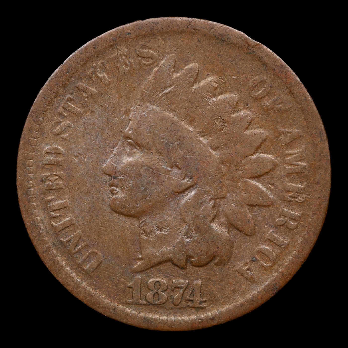 1874 Indian Cent 1c Grades vg+. According to Jaime Hernandez from PCGS, The 1874 Indian Cent is somewhat of a scarcer issue. Semi key date that in circulated grades carries a premium over the type coins in the series. With an original mintage of over 14.2 million; PCGS estimated that only 6000 survive in all grades.