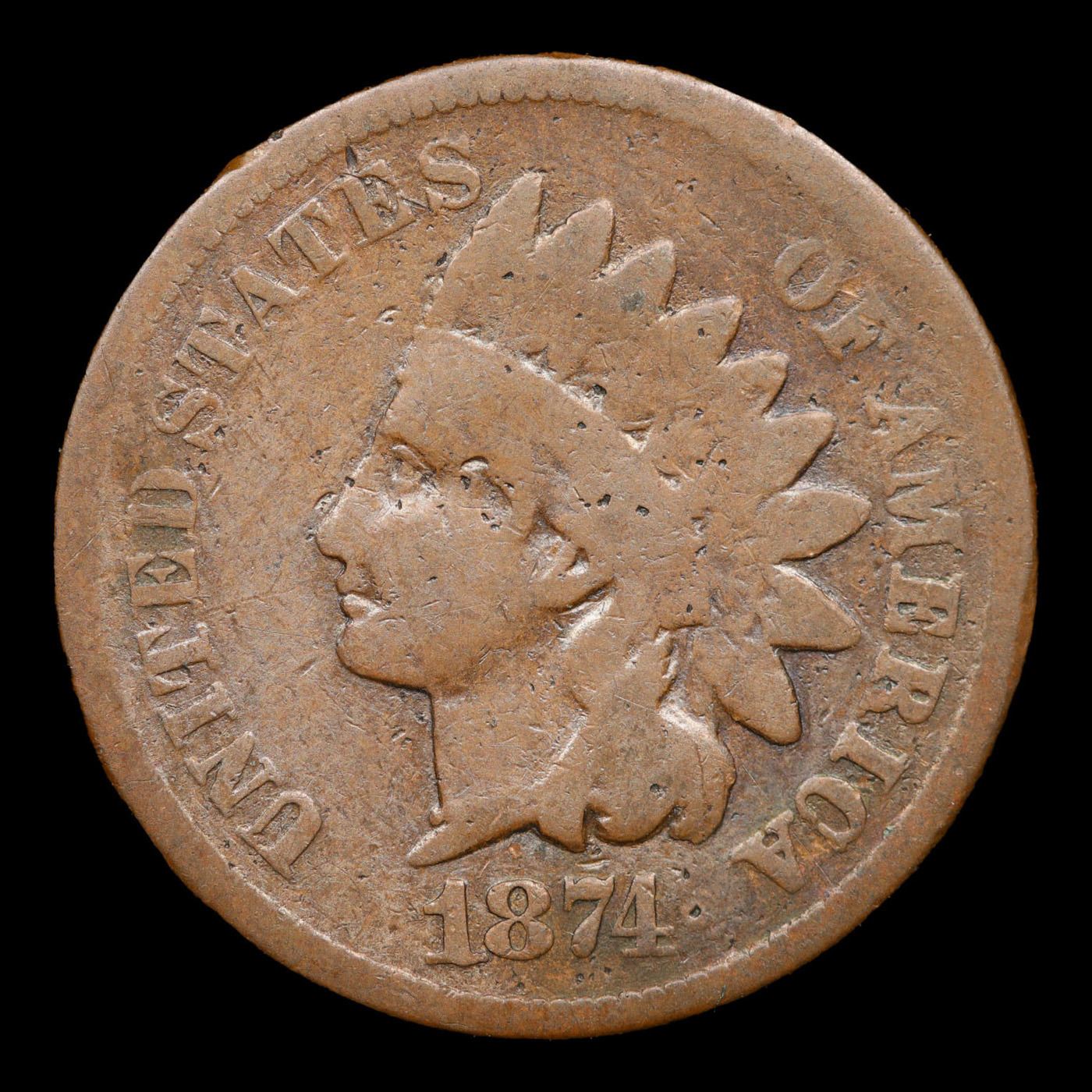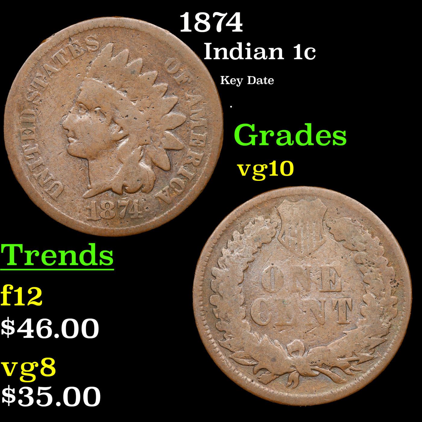 1874 Indian Cent 1c Grades vg+. According to Jaime Hernandez from PCGS, The 1874 Indian Cent is somewhat of a scarcer issue. Semi key date that in circulated grades carries a premium over the type coins in the series. With an original mintage of over 14.2 million; PCGS estimated that only 6000 survive in all grades.