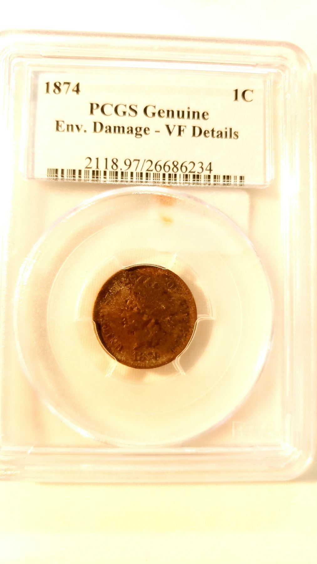 1874 Indian Cent Grade: PCGS VF