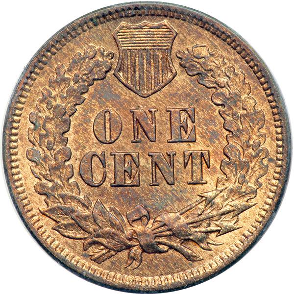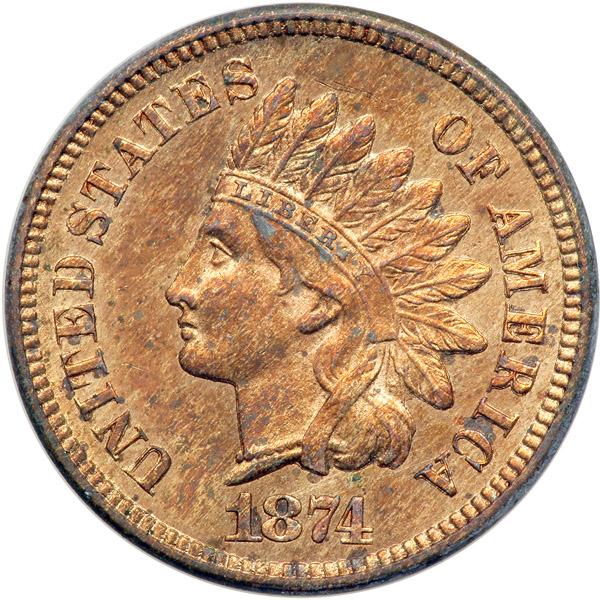1874 Indian Head Cent. PCGS Genuine, questionable color. Our grade is MS-60+ with flyspecks and possibly dipped long ago (PCGS # 2119) .