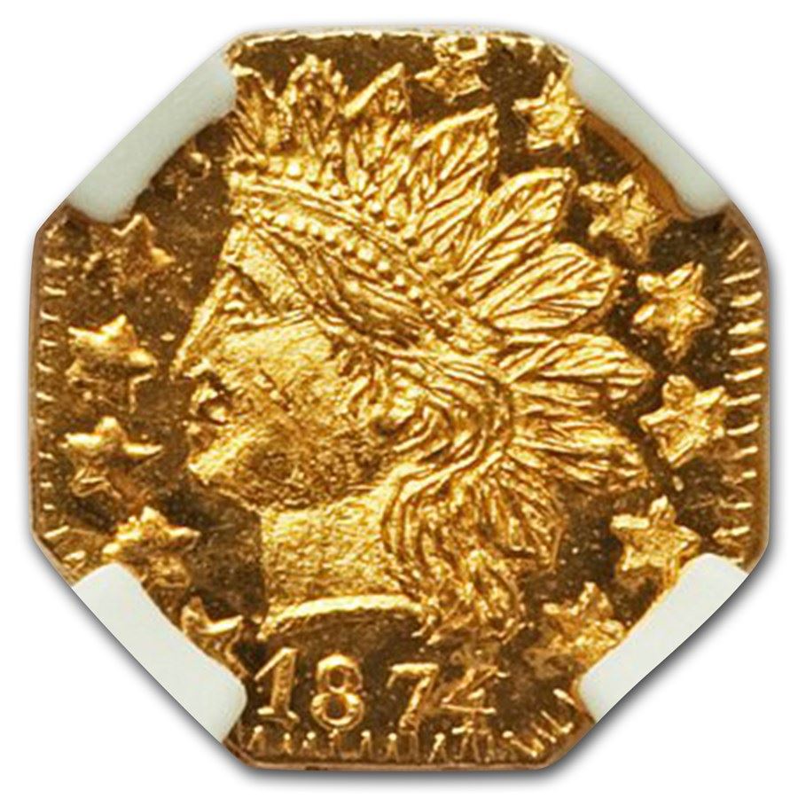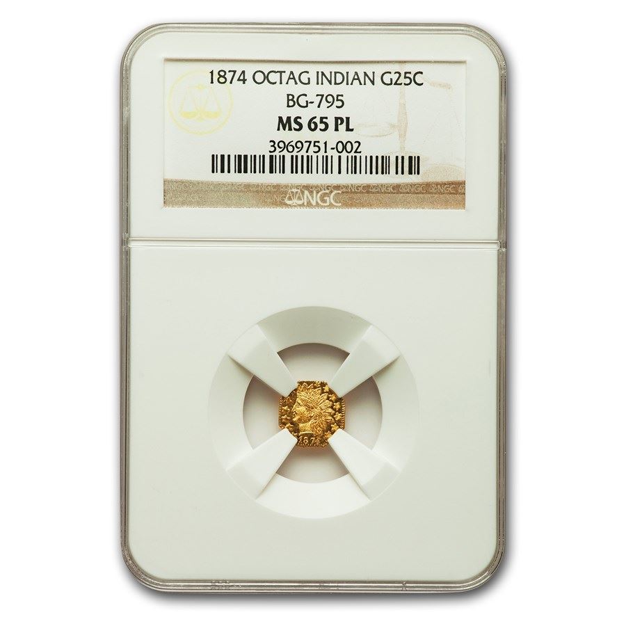 1874 Indian Octagonal 25¢ Gold MS-65 NGC (PL, BG-795)