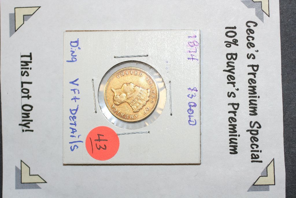 1874 Indian Princess $3 Gold Coin w/ding, VF+ Details **CeCe's Premium Special 10% Buyer's Premium-This Lot Only!**
