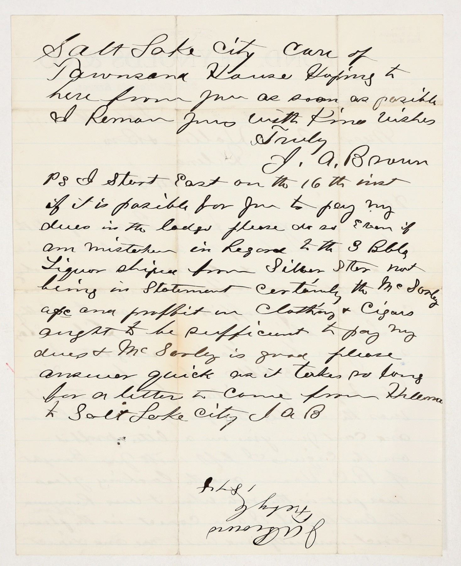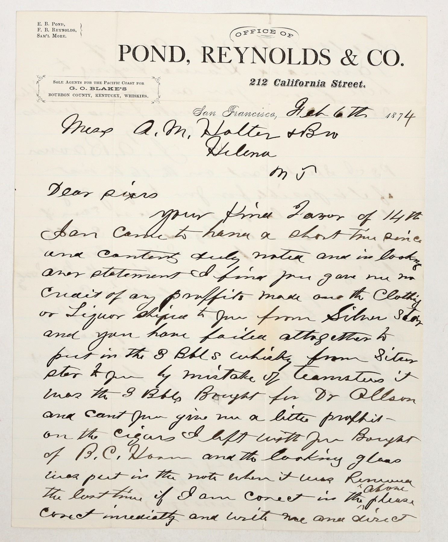Letter from Pond, Reynolds & Co., sales agents for G.O. Blakes Kentucky Whiskeys.