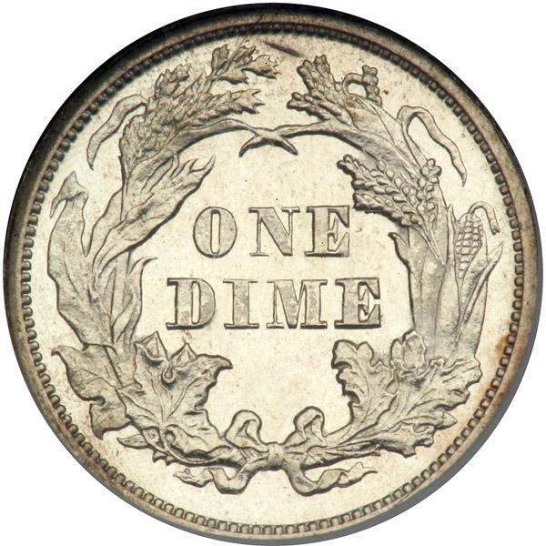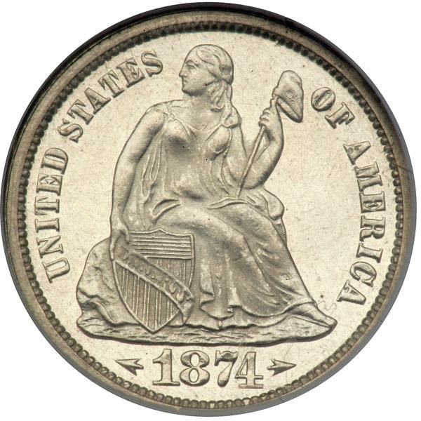 1874 Liberty Seated Dime. Arrows. NGC graded Proof 66 Cameo. A blazing white Gem Cameo Proof! Only 700 Proofs struck. Originally preserved, the surfaces are intensely reflective with swirling frost on the devices. According to our observations, including the key highpoints of Liberty and the wreath, the strike is above-average, in fact sharp, in all areas. Pop 4; none finer.