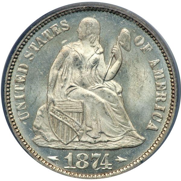 1874 Liberty Seated Dime. Arrows. PCGS graded MS-66. A frosty white example with semi reflective surfaces on the obverse. Both sides display the typical "look" for this With Arrows P-mint delivery: thickly frosted surfaces, though slightly reflective, rolling cartwheel effects, and boldly struck frostier devices. A modestly ineffectual imprint was left by the rebound of the dies that struck this Dime as seen in the lack of definition on Liberty's face and the Liberty cap. Most other areas are distinct or nearly so. Scarce two-year Type.