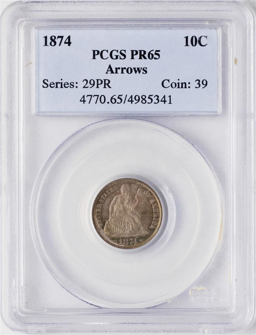 One 1874 Proof Seated Liberty Dime Coin Arrows PCGS PR65. PCGS Graded.